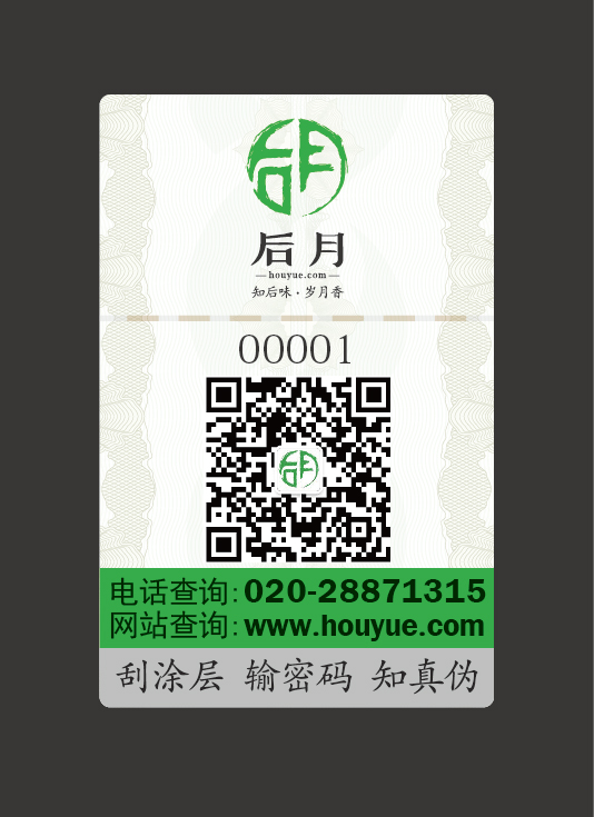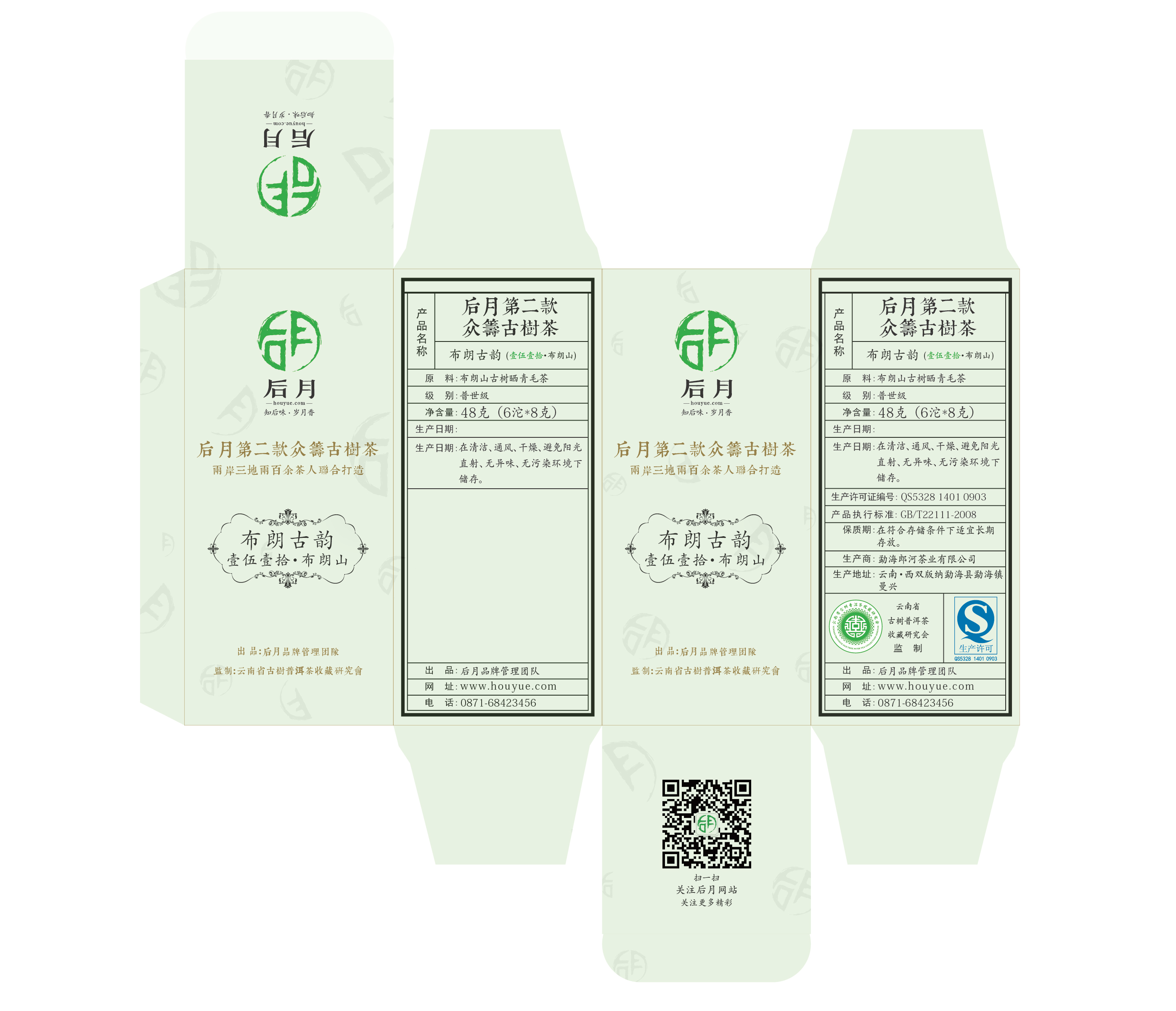 在包装上,后月第二款众筹茶延续第一款的总体风格,核心成员、VIP1、VIP2的LOGO继续享有设计在外包装的权利,有利于各自品牌的宣传与布朗古韵·壹伍壹拾·布朗山的多渠道销售;关于内飞,第二款众筹茶别出心裁制作了“后月”品牌的镂空标志,避免了笋壳的染色;第二款众筹茶还制作了牛皮纸盒与纸袋,每提普洱茶的笋壳拆掉后,可单独分装进行商业销售,既干净整洁,又美观大方,独有的设计与包装只给后月第二款众筹古树普洱茶,有利于产品的销售与品牌推广以及未来的持续众筹合作。