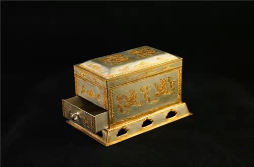 茶罗子,即茶筛。它是饼茶经茶碾碾成碎末后作筛茶用的。由盖、身、座、罗、屉组成,鎏金仙人驾鹤纹装饰。罗分内、外两层,中间夹有罗网,极为细密,抽屉有拉手。经罗底筛下的茶叶末落入抽屉中,煮茶时,可从抽屉中取出茶末。通高9.5厘米,罗身长13.4厘米,宽8.4厘米。均系钣金成型,纹饰涂金。盖顶錾两体首尾相对的飞天,并衬以流云。盖刹四周各饰一和合云。罗架两侧饰执幡驾鹤仙人,另两侧为相对飞翔的仙鹤,四周饰莲瓣纹。