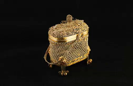 条结笼子,主要供烘烤饼茶后,趁热装入纸袋,作为一种贮器,暂存于此。该茶具通高15.0厘米,全重335克。有盖,直口,深腹,平底,四足。盖为穹顶,笼有提梁,盖与提梁间有链相连。整个笼子用极细的金银丝编织而成。