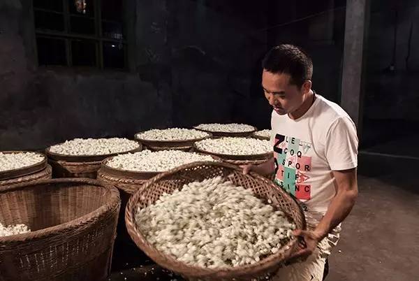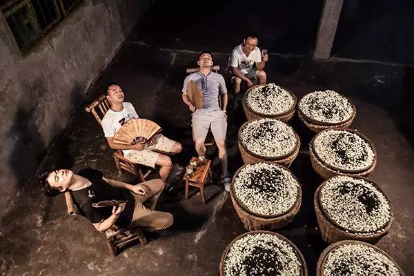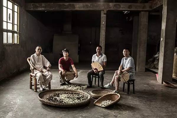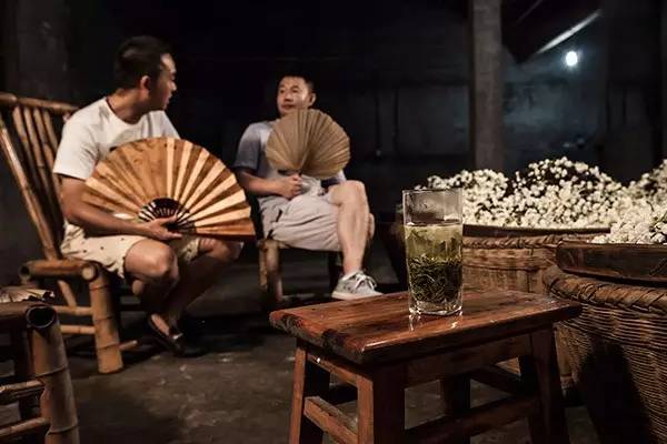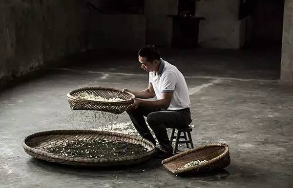 经过一夜的窨制,花的吐香被茶胚吸取。忙了一夜的老贾冲凉换了衣裳,开始了新的工作。窨制完成的残花通过竹筛分离出来,这茶就算完成了一次窨制,静置一段时间后,这些茶叶将再次经历一次次不眠的夜晚,经历炒香干燥,加入新鲜的干花点缀才算制成。