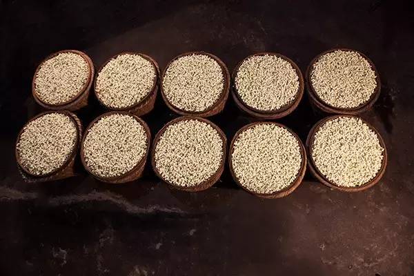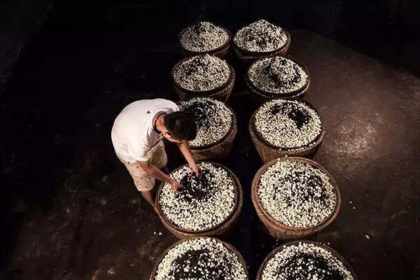 筛掉未开的花骨朵,最完美的花朵便要开始与茶“洞房”了。拌合的过程比例是关键,做了三十多年茶的老贾只需用手掂量,便能准确配置用料的重量。拌合过后的花与茶被堆成了一座座小山,提高温度使茶叶充分吸收花的吐香。老贾整夜都得守候,随时通过堆放控制内部的温度,保持最佳的温度。