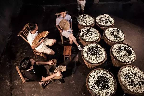 花茶开始堆放窨制,这一过程需要整夜的时间