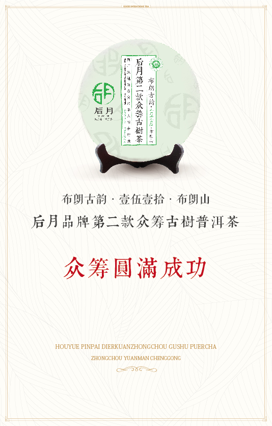布朗古韵·壹伍壹拾·布朗山——后月品牌第二款众筹古树普洱茶项目众筹成员共102人,众筹资金共计:2428000元,感谢每一位成员的信任与参与,感谢每一位朋友的宣传与推广,再次真诚的感谢!