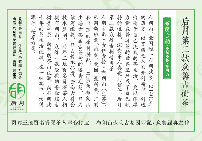 布朗古韵·壹伍壹拾·布朗山——后月品牌的第二款众筹古树普洱茶,超越第一款众筹茶——壹伍壹拾·六山饼的参与成员与金额,依旧是两岸三地百名资深茶人联合打造,依旧是吕建锋作为发起人、云南省古树普洱茶收藏研究会会长黄小元作为技术负责人。在总结第一款经验的基础上,后月第二款众筹古树普洱茶将更加完善、成熟,更考虑细节、防伪,维护众筹成员的根本利益。