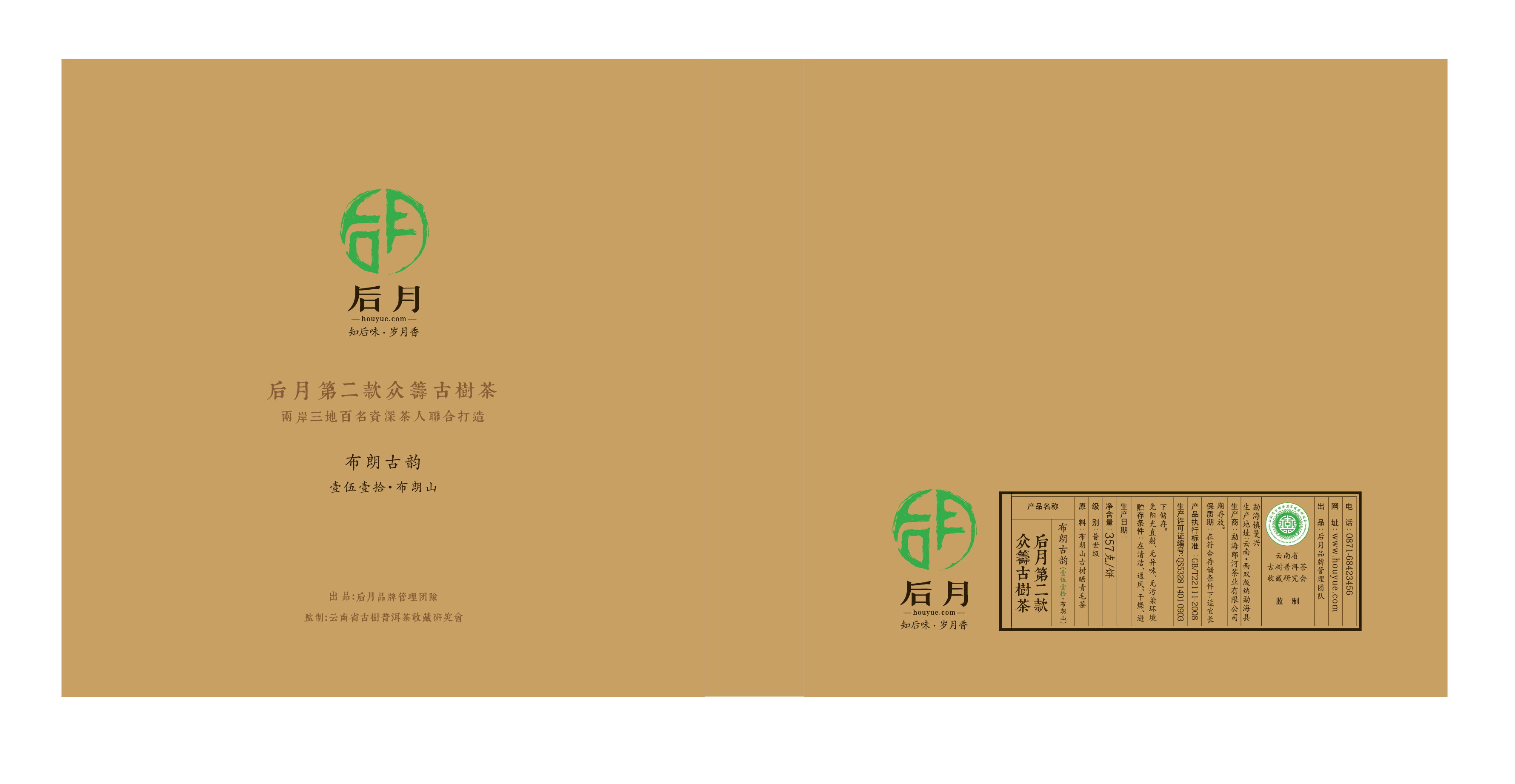 在包装上,后月第二款众筹茶延续第一款的总体风格,核心成员、VIP1、VIP2的LOGO继续享有设计在外包装的权利,有利于各自品牌的宣传与布朗古韵·壹伍壹拾·布朗山的多渠道销售;关于内飞,第二款众筹茶别出心裁制作了“后月”品牌的镂空标志,避免了笋壳的染色;第二款众筹茶还制作了牛皮纸盒与纸袋,每提普洱茶的笋壳拆掉后,可单独分装进行商业销售,既干净整洁,又美观大方,独有的设计与包装只给后月第二款众筹古树普洱茶,有利于产品的销售与品牌推广以及未来的持续众筹合作。