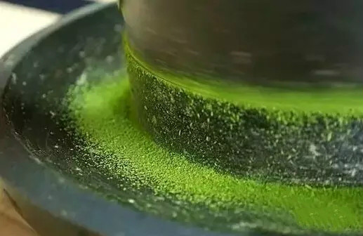 用石磨碾磨的抹茶在显微镜下显示被撕裂状薄片,只有2~20微米。现在也有用气流粉碎机或球磨机粉碎的,细度均达不到石磨的细度。到目前为止,还没有国家调试出抹茶的香精来,它是纯天然的。