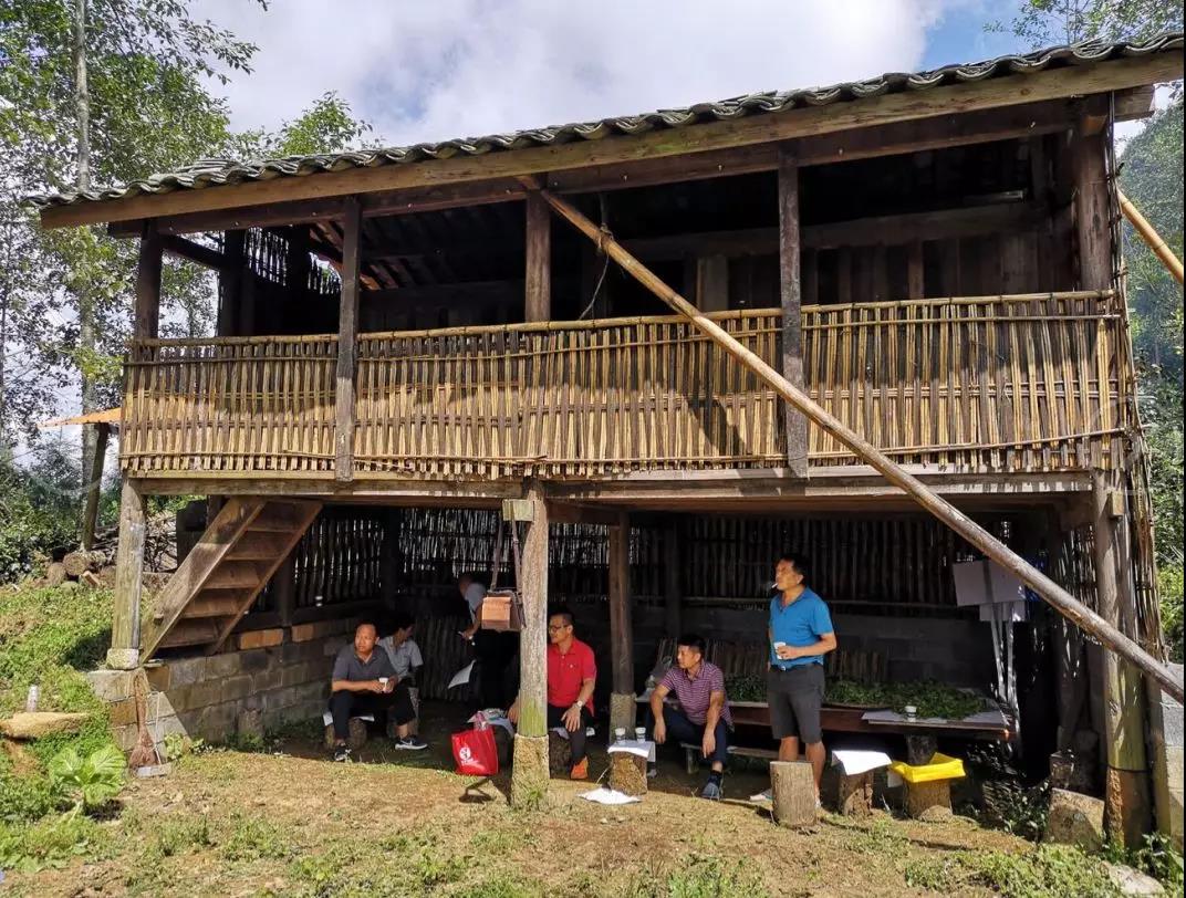 茶园中央较平处有一座简陋的木楼阁,一楼立着几根木柱,四面用竹栅围着,泥地板上摆着几条长凳子,凳子上搭着一些木板,木板上零星放着簸箕,内盛几小堆刚刚采摘好的鲜叶嫩芽;簸箕盛不下的直接倒在垫有白色纸张的木板上。一楼里外,散摆着十来只水冬瓜木锻成的木桩凳子,来者各自找位坐下歇息,谈论先前茶园见闻。