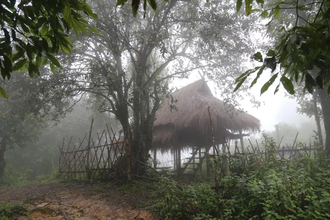 穿过竹林掩映的弯曲山路和热带地区独有的望天大树,我们终于停在了一片泥泞的路边。一下车是便感受到湿气迎面扑来,流动的雾气把一切事物的边界都变得模糊暧昧不清,雾气氤氲,仿若异世。奢侈地踩着树上落下的多依果往前,一间略有些歪斜的茅草屋渐渐从白雾中透出来。布满蜘蛛网的篱笆后是一张一米多见宽的竹编桌子,虽然有些破旧,在这样静谧的环境中有桌如此,多年前大概是用作弹琴会友的吧。“这是一间初制所。”同行人无情地打破了我的幻想。茅草屋左边还真是修了一座杀青灶台,不过谁说炒茶就和弹琴相互矛盾了呢。