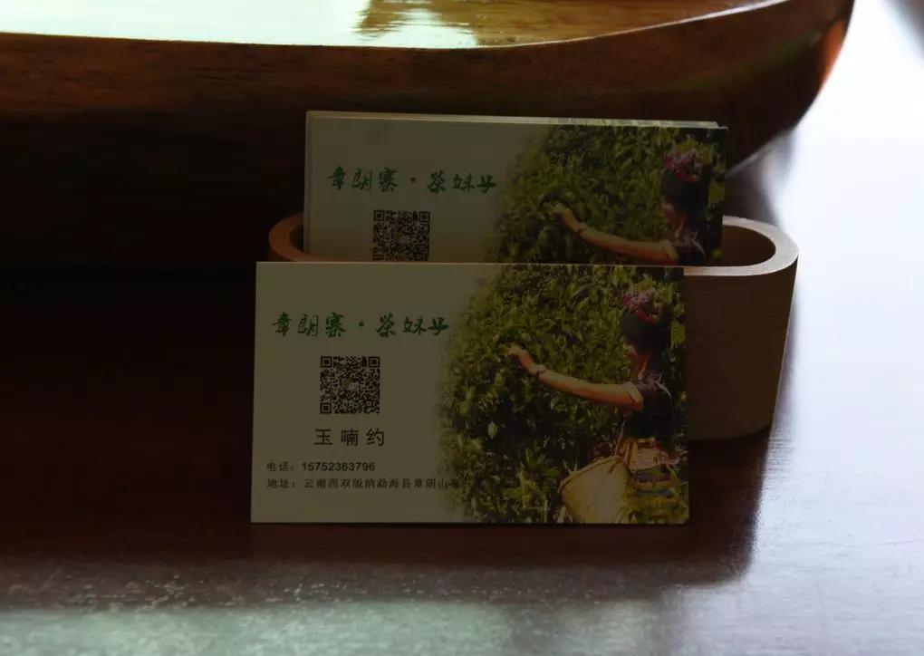 人们总说章朗的茶是被佛光笼罩的,好像的确如此。通过老曼峨缅寺的小和尚介绍,我们得以结识章朗96年的小茶人玉喃约。小玉和老曼峨的帕上和尚是朋友,两人因茶而结缘,常坐在一起交流喝茶体验,我也同样因为在缅寺喝茶得以认识帕上。一在她家坐下,便看到茶台前放置着她的名片:章朗寨茶妹子,上面附有二维码,名字和联系电话,年纪轻轻便已具备良好自我营销能力,实在不可小觑。
