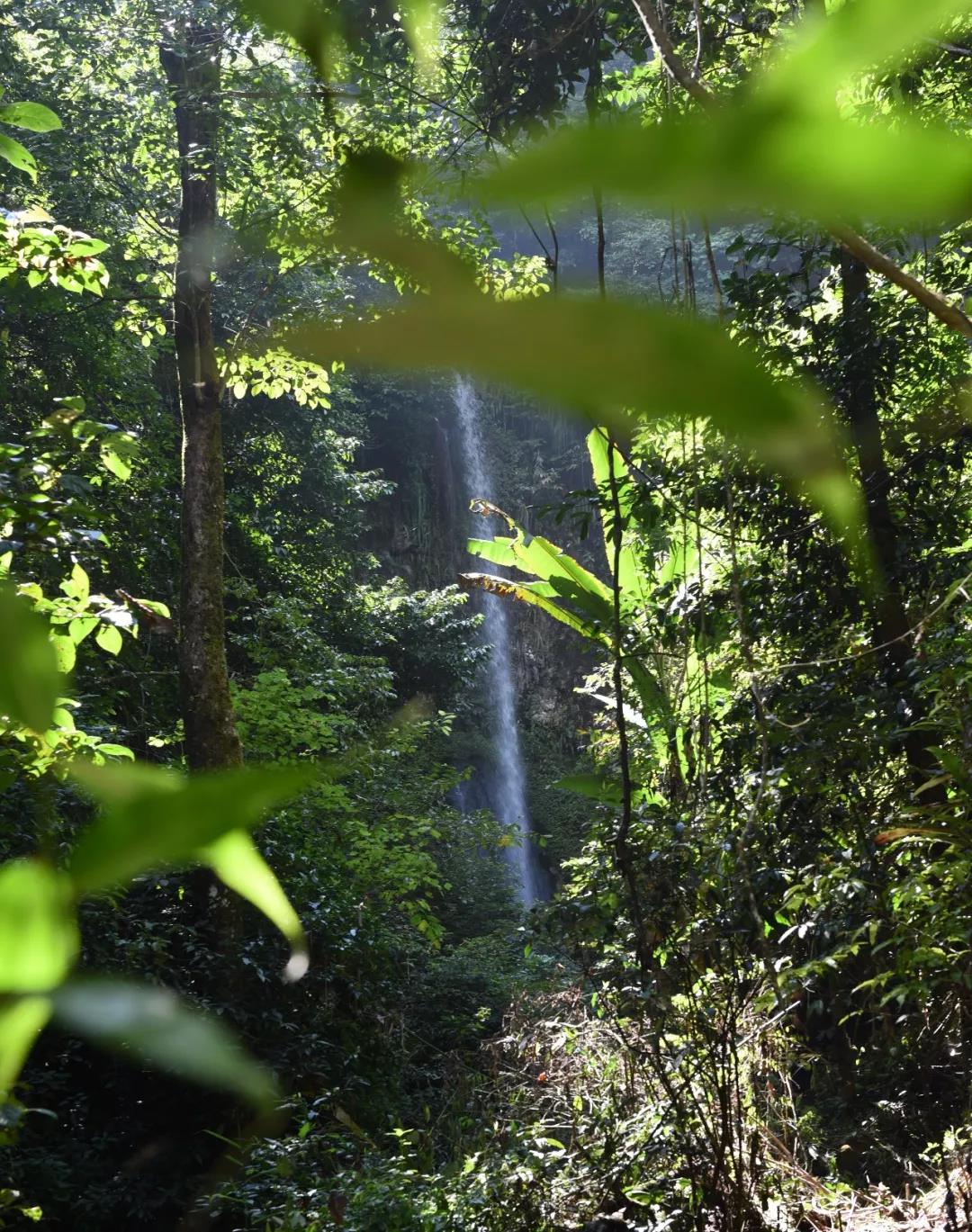 路比想象的难走许多,一路上只闻轰鸣水声不见其踪影,山势险峻,时常需要抓着树干前行,我有心无力地看着岩拉身轻如燕地游走在乱石间,落到了队伍最后。跨过一条湍急溪流时,一个没注意整个人摔进了水中,相机的镜头也被撞裂开。狼狈地从水中挣扎起来没来得及叫痛,就听到了队伍前面发出的惊呼。一抬头,一线气势汹涌的瀑布便如天外来客般骤然降临在眼前,水声隆隆,整座山似乎都在一起轰鸣,突然间,我被一种难以名状的感动侵袭得无法走动。若不是周围热带植物的映衬,定会觉得自己行至了范宽《溪山行旅图》画卷尽头,画中一线飞流同眼前一样壮美绝伦。山水画中深山幽谷尽头一泻而下的飞流,常常代表文人们心中的桃花源,而眼前这股无法找到源头的飞瀑,或许就从桃花源处滚滚而来。