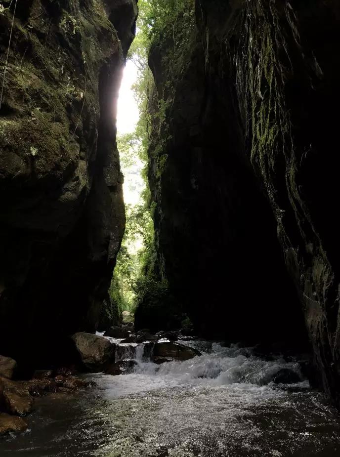 衣服还未干,岩拉又带着我们去往虎跳峡。漫过膝盖的水流没有让我们有任何犹豫,又踏入了河中,摸着石头前行。不是没有见过一线天,但都是站在临空而建的栈道上,从未以如此直接原始的方式接触如此绝景。两边的石壁以压倒之势遮天蔽日,头顶只留一三米宽缝隙。前面是一片翠绿与光芒,水源源不断地向我们涌来,那个被憧憬千年的桃花源,会不会就在尽头?岩拉看水势湍急决定不再向前,那么这里便是我们冒险之路的尽头了,不得已只好与梦境告别。