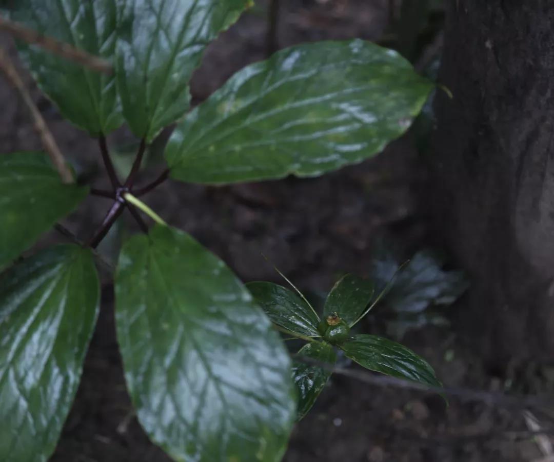 茶王树出现得那么突然,美得让我有些说不出话来。茶王树枝干既不过于直挺僵硬又显示出韧性,主杆如成年人手臂般粗实匀称,分枝颇高,舒展得天然自在,远离人类干扰,线条柔顺,气质温和,还有一枝从侧边垂下。不由地令人想起麦积山的南北朝佛造像。佛像左手常自然下伸,指端下垂做与愿印,而其向上伸展的主枝则像做令众生心安的无畏印,整体给人以清秀和不可言说的超凡脱俗之美。巧合的是,在侧枝下,恰好生长着一株重楼,又名五叶一枝花,这株低矮的草本植物像是在茶王树膝下玩耍的孩童,叶片被雾气打湿,苍翠欲滴中更添一丝灵气。