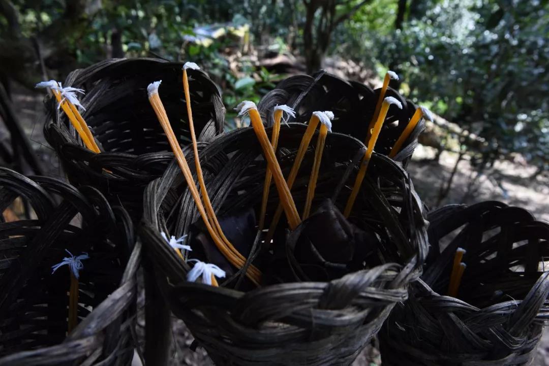在两层台阶的祭祀台上,茶王树被竹篱笆围起来,周围放置以显示其神圣地位。人类就是如此,不把树围起来,不显示其难以接近就不能明白古树的珍重可贵。章朗村每年都会举行祭祀仪式,滴水,在竹编的祭祀烛台里放入糯米饭,蜡条,以向神灵祷告,讲明采茶用意,望神灵予以同意,同时祈求来年茶树也能丰收。或许在今人看来这样的祭祀难免有些愚昧,但灾难总是和人们的行为密不可分,人定胜天,科学种植是一种很好的态度,然而真正热爱自然,热爱茶树的人依然明白:对待茶树要小心翼翼,需要一边安抚一边前行。每年的祭祀奉纳,正是对神灵们小心翼翼的安抚。