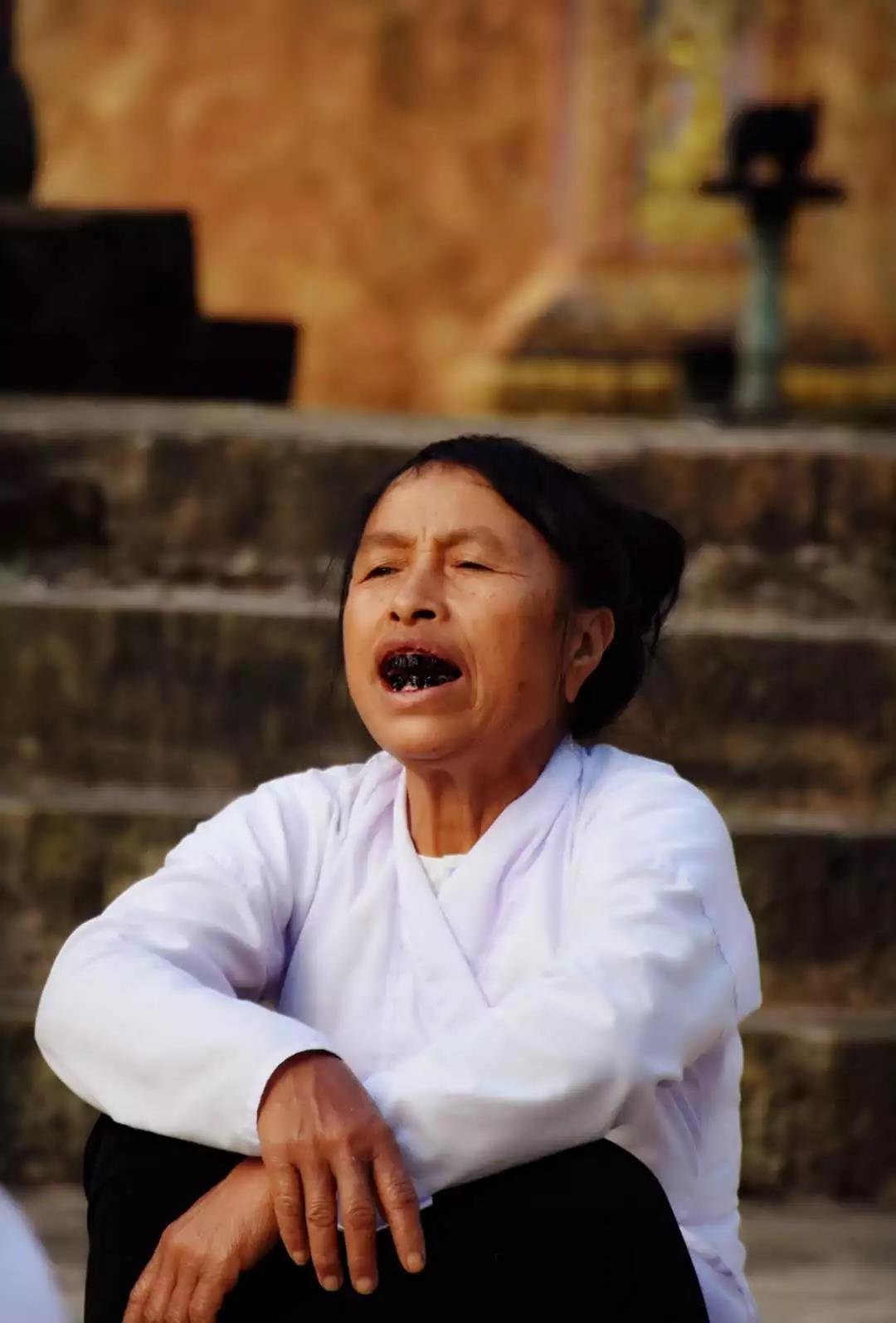 今晚有关门节活动,人们正围坐在佛寺前享受诵经前的清闲,留意到人群中有位奶奶仍保留有漆齿。“漆齿”,第一次知道是在《阴翳礼赞》中,谷崎润一郎提到古时日本贵族以黑齿为美。而布朗族也有同样的习惯,在十四五岁成年时便要咀嚼由栗树嫩叶,石灰,旱烟等配制而成的“槟郎”,将牙齿染成紫黑色,此举同时还有防蛀的功效。距离如此之远,却拥有相同的习俗,难怪有猜测说日本的先祖在云南。