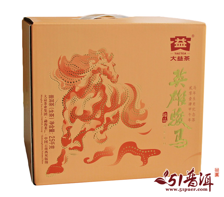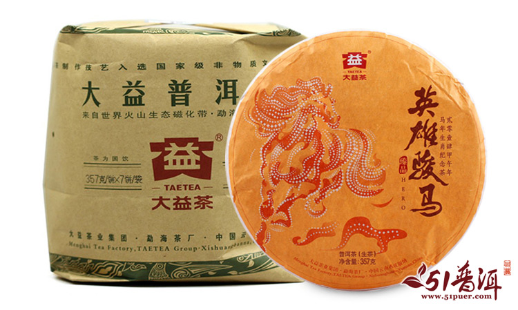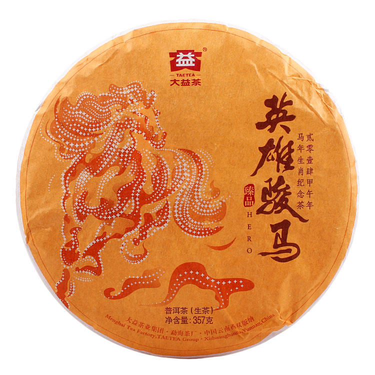 “英雄骏马”(生茶)是大益集团继生肖纪念茶“瑞虎呈祥”、“宝兔迎财”“龙腾盛世”“灵蛇献宝”之后推出的又一款生肖纪念茶品,每饼357克,其原料精选勐海地区高山大树茶,绿色生态,经国家级非物质文化遗产“大益茶制作技艺”精心加工而成。该款茶品饼形端正,圆润厚实;条索肥硕,舒展优美,色泽墨绿油润;汤色金黄透亮,富有粘稠感;滋味浓强刚烈,口感丰富协调,回味绵长,韵味十足;花香纯正,优雅持久。选料的考究,做工的精细,再配以大气典雅的包装,“英雄骏马”属茶友与消费者品饮、收藏、礼节馈赠的佳品。