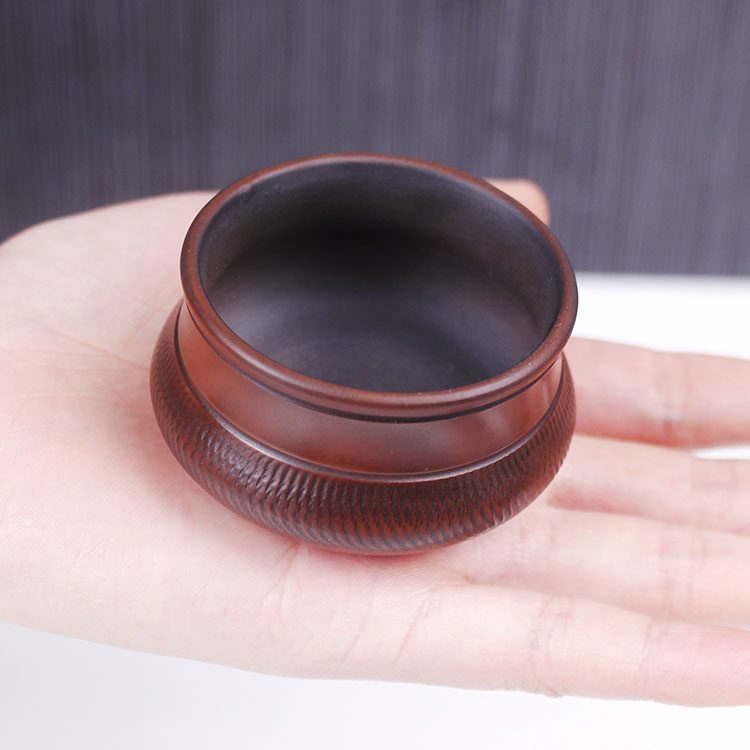 此杯为素杯为古铜色泥料的挑刀纹,杯身素雅无装饰,以显素之雅韵。
