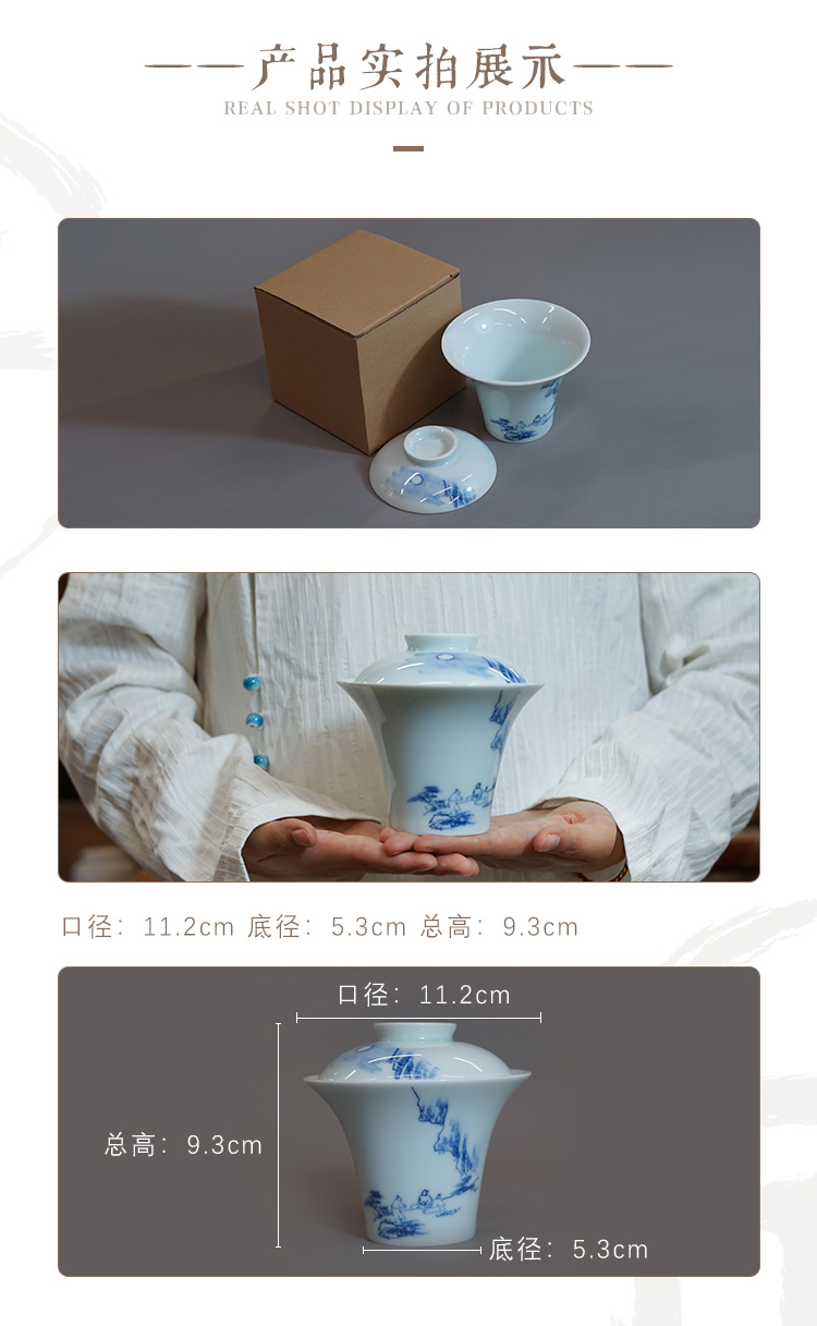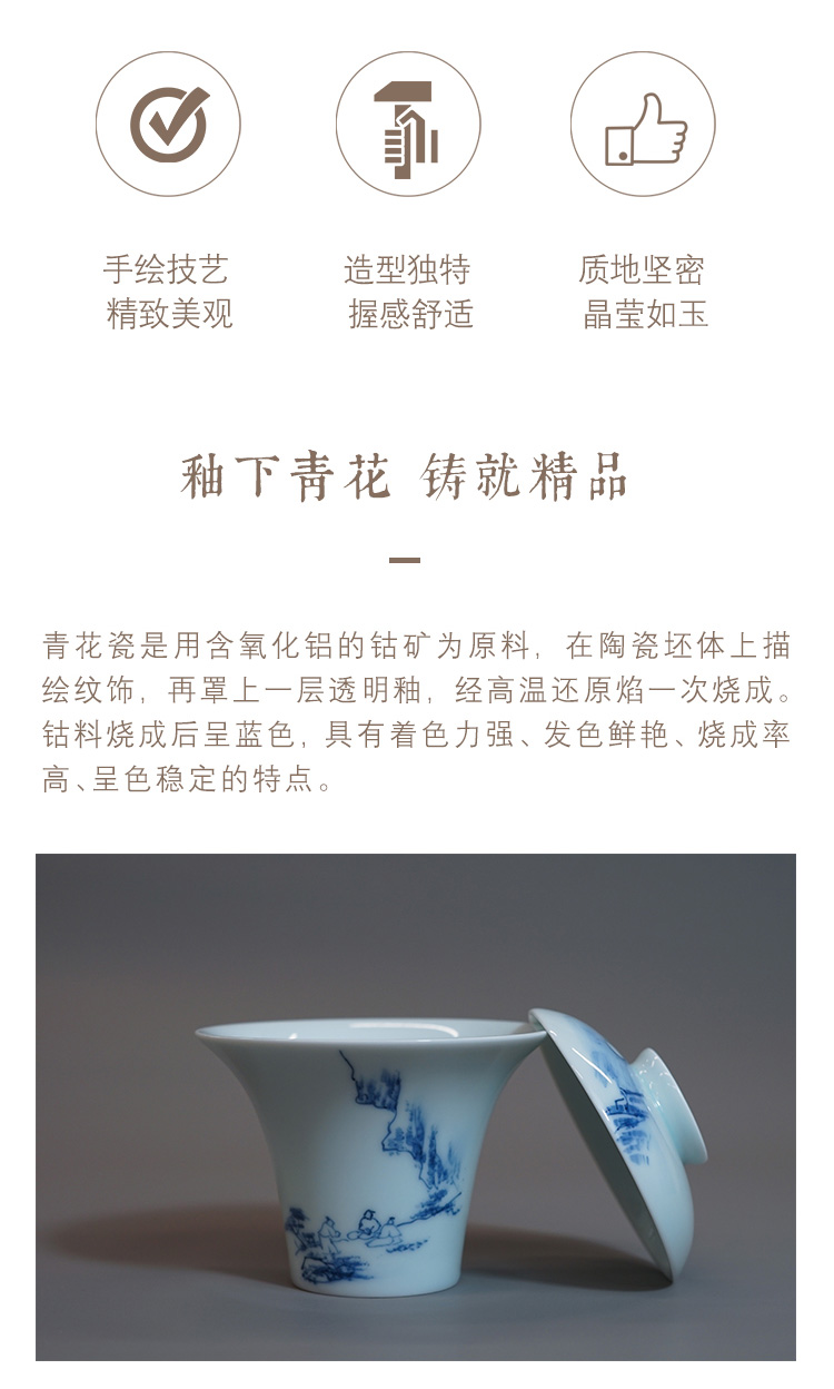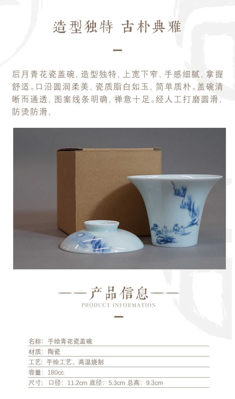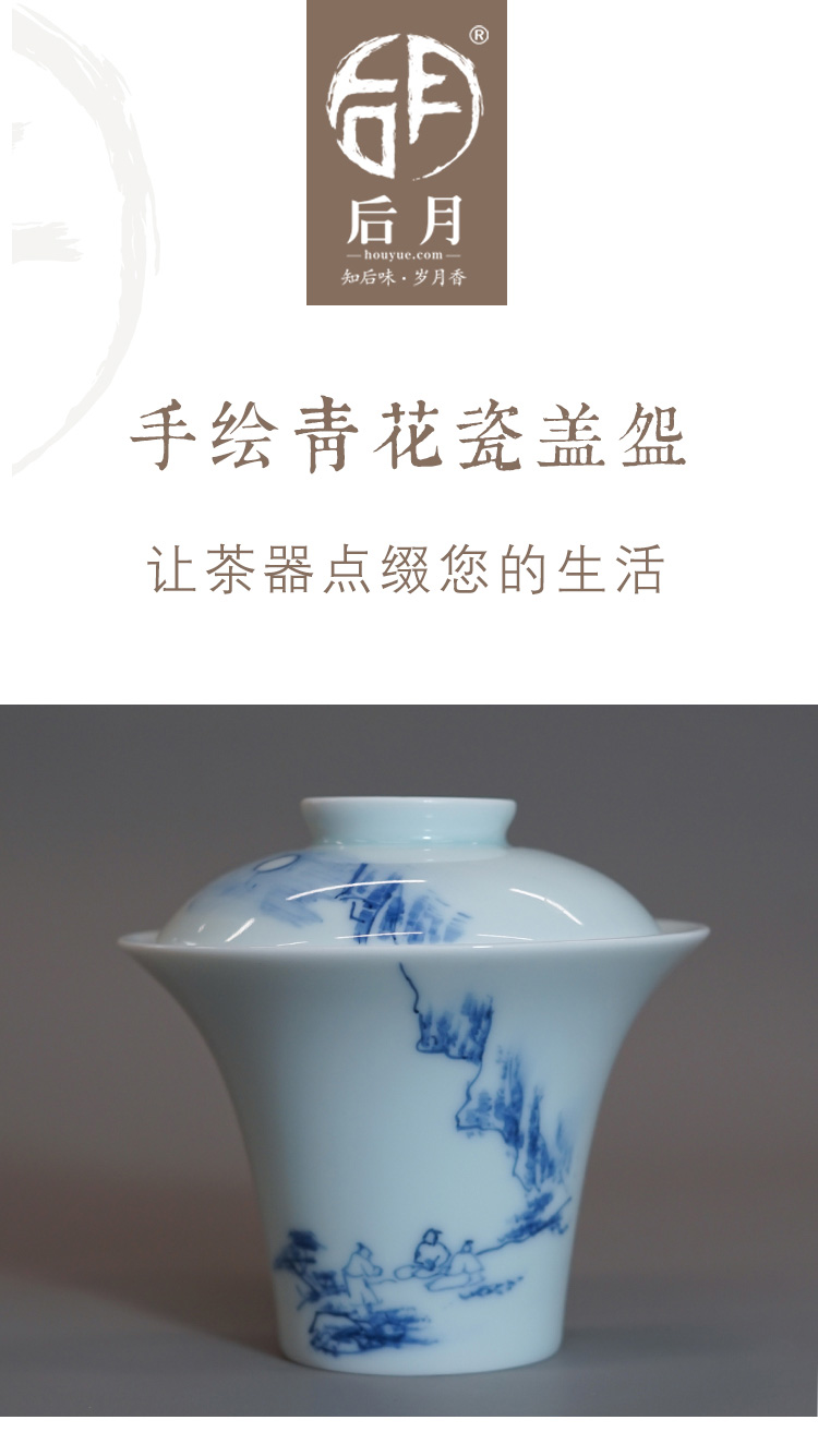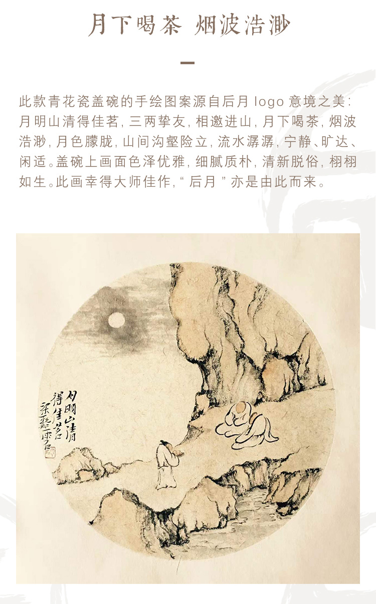 后月 青花瓷盖碗 月下喝茶 烟波浩渺 手绘工艺 180cc大容量