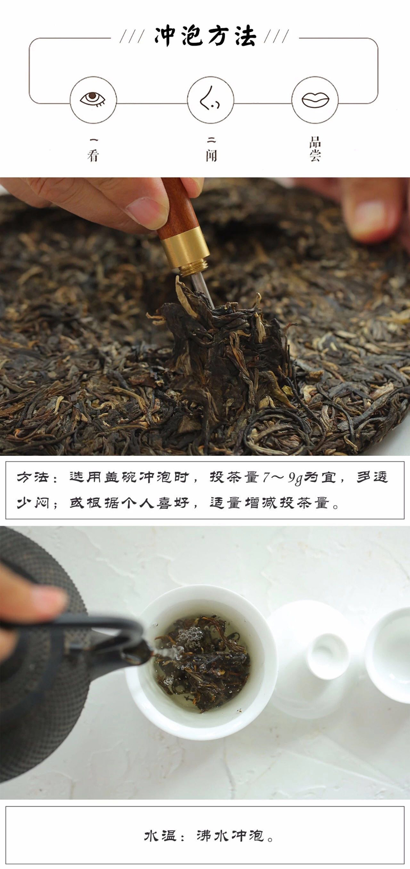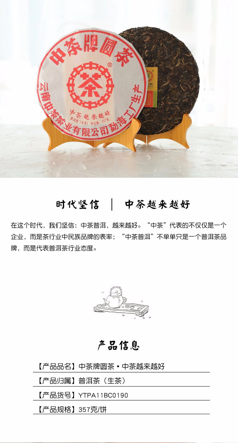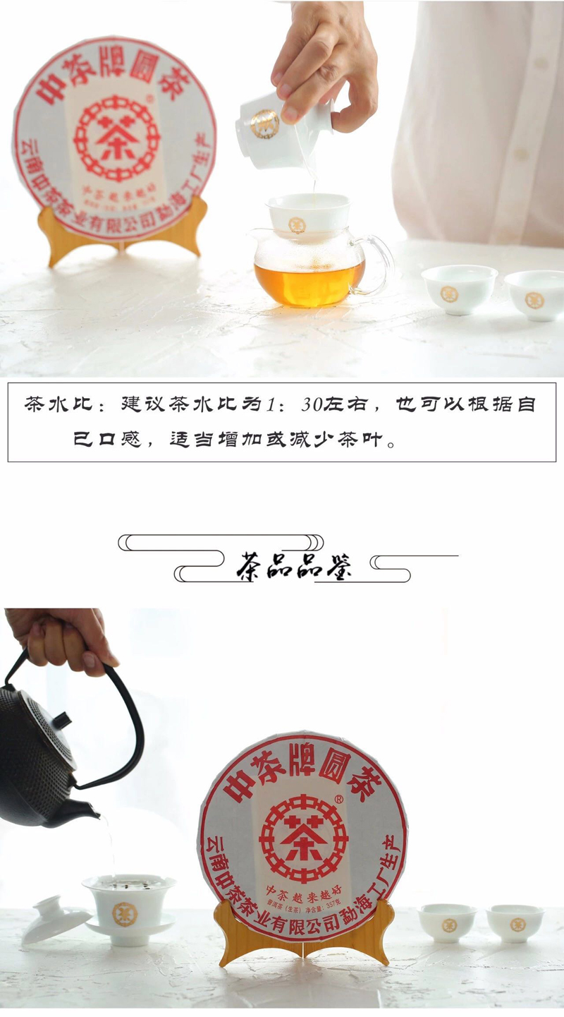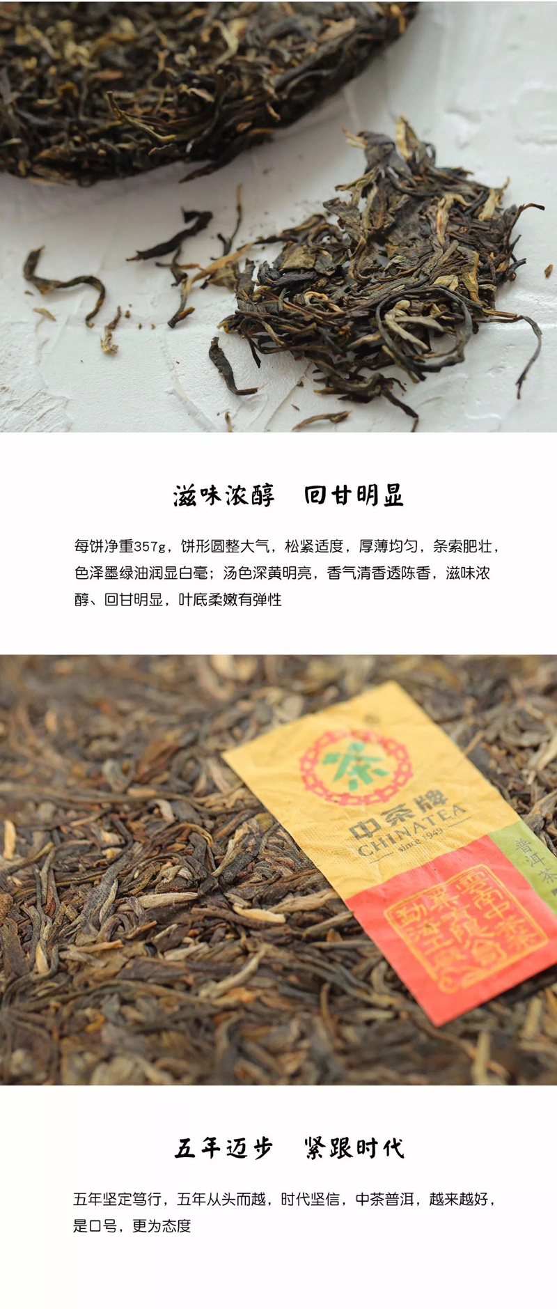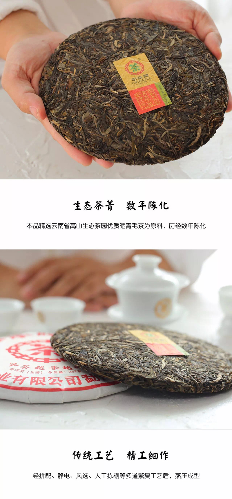 精选云南省高山生态茶园优质晒青毛茶为原料,历经数年陈化,经拼配、静电、风选、人工挑剔等多道繁复工艺后,蒸压成型,饼形圆整大气,松紧适度,厚薄均匀,条索肥壮,色泽墨绿油润显白毫;这款茶选用历经多年陈化的优质晒青毛茶原料,再加上中茶精益求精的加工工艺,旨为消费者奉献一杯品质越来越好的中茶普洱茶。