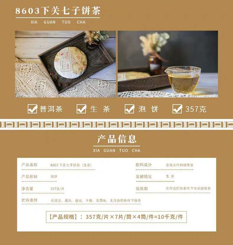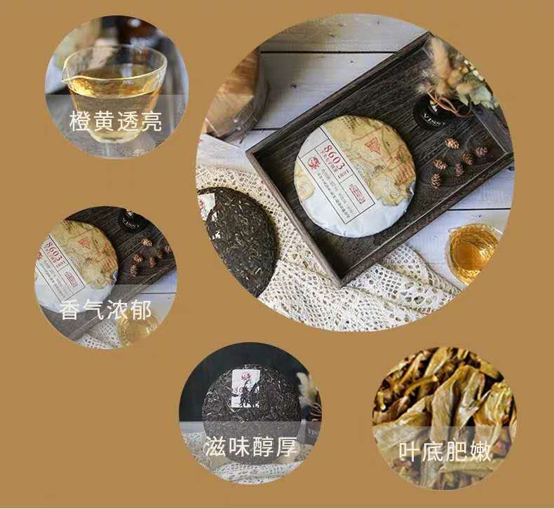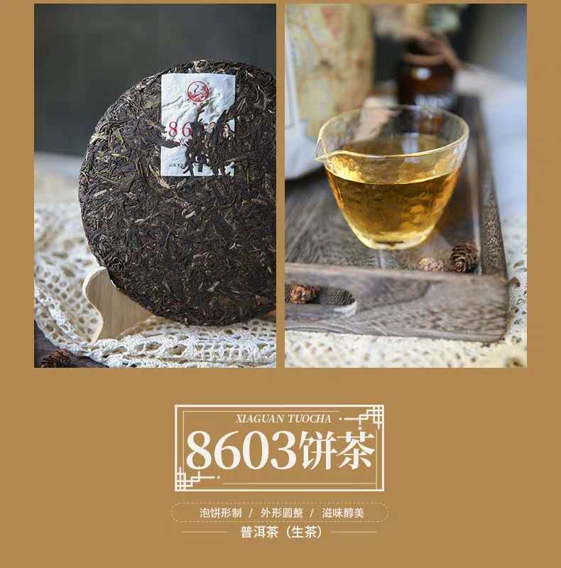 2019年,8603饼茶升级归来,新普洱时代,数字唛号只是一个名称,不再是原料等级的代号。8603饼茶,精选5-6年高原仓陈化原料精制,老料新压,不断升级的加工技术工艺,打造即开即饮的优秀口感,让传统茶品焕发新的魅力。经典的配方让8603拥有很高的知名度。以数字唛号为名,独特易记,后期陈化转变,口感喜人!