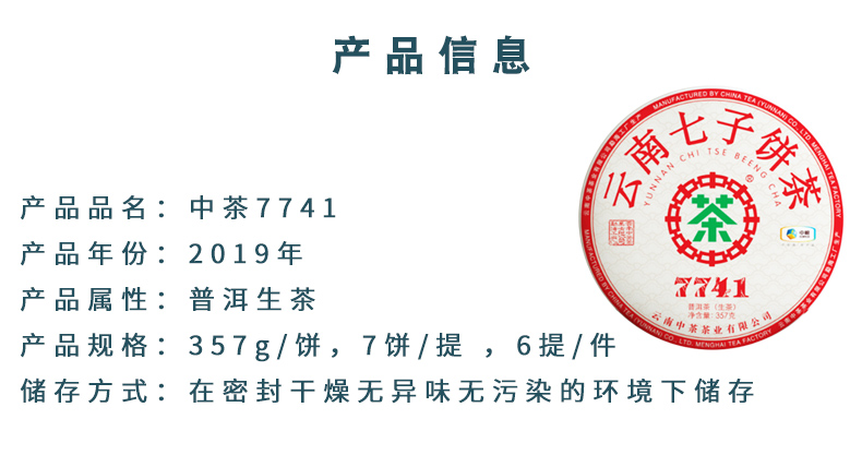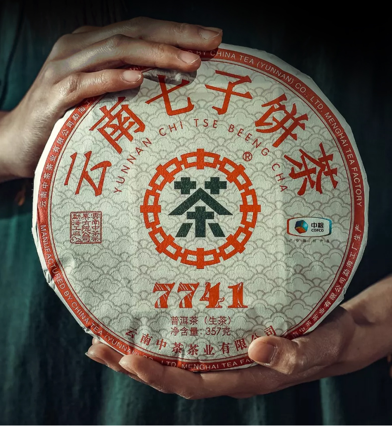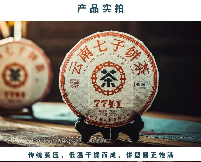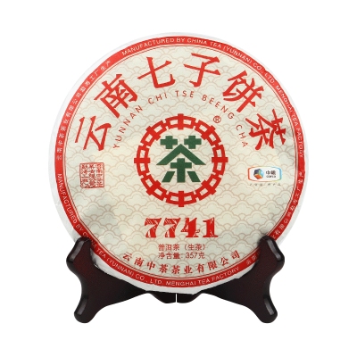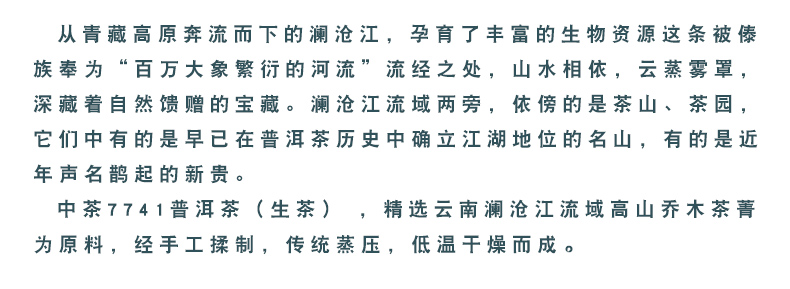 中茶7741普洱茶(生茶),精选云南澜沧江流域高山乔木茶菁为原料,经手工揉制,传统蒸压,低温干燥而成。