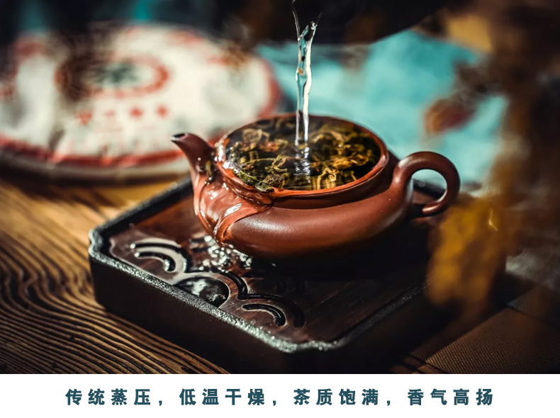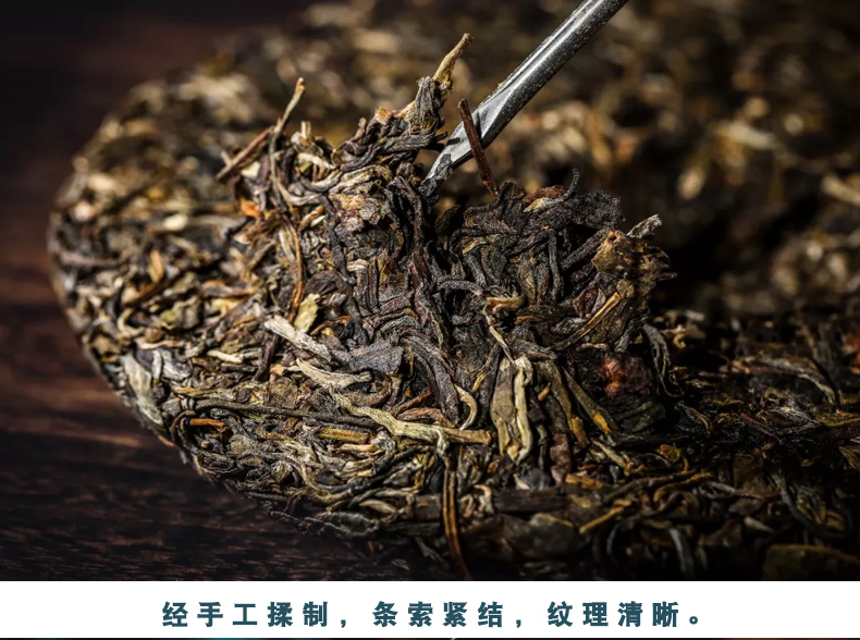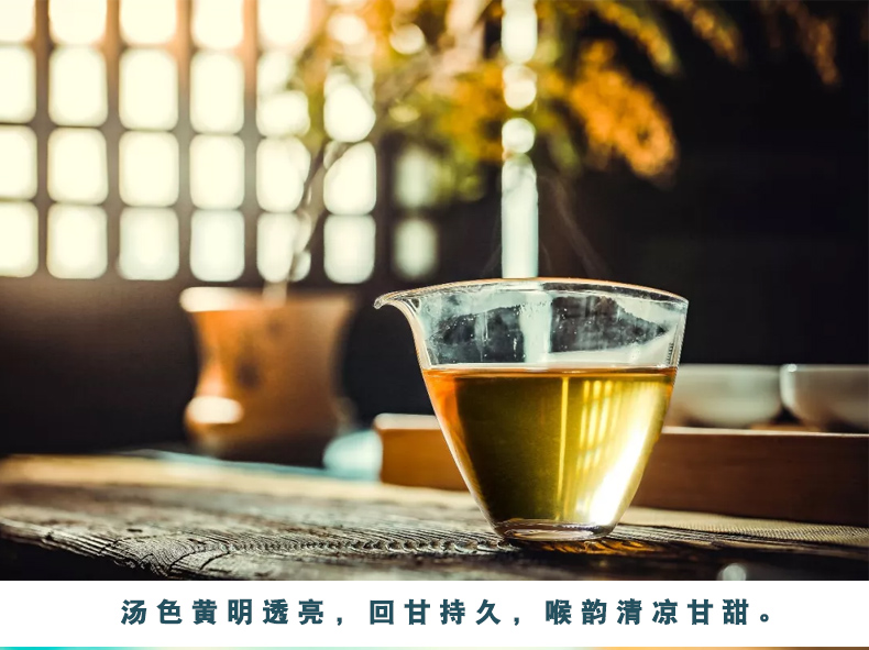 这款茶饼型圆正饱满,条索紧结,纹理清晰;汤色黄明透亮,茶质饱满,香气高扬,回甘持久,喉韵清凉甘甜。