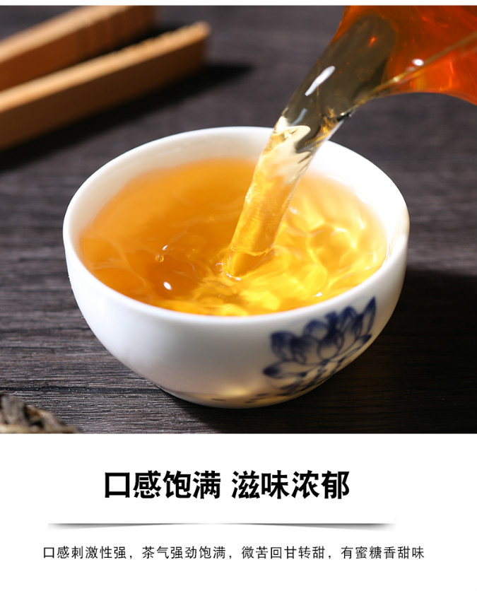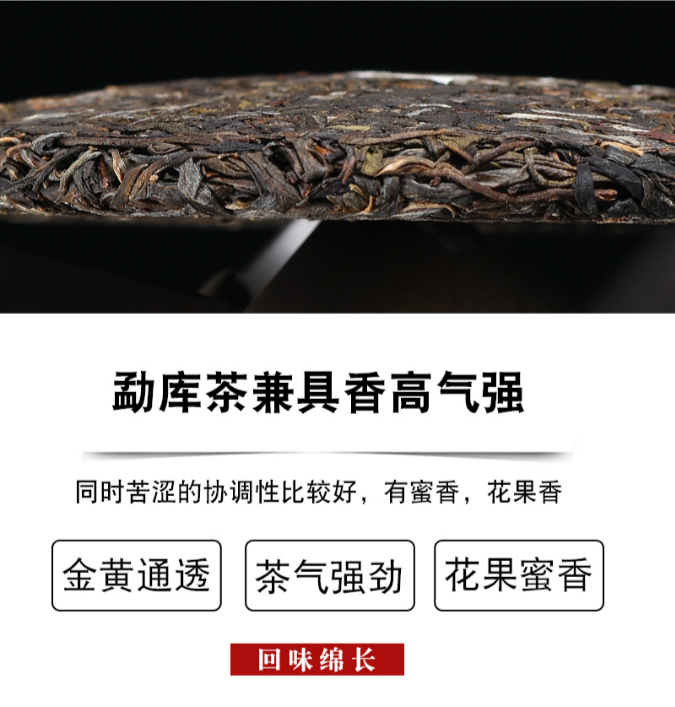 为了贴合名称里的香字,选用了以香闻名的勐库茶,开汤第一泡茶汤就带有浓郁的蜜香味,正真符合了水含香的特点,喜欢香甜、口感轻盈的茶友这是一个不错的选择。茶气强劲饱满,微苦回甘转甜,有蜜糖香甜味。