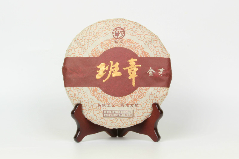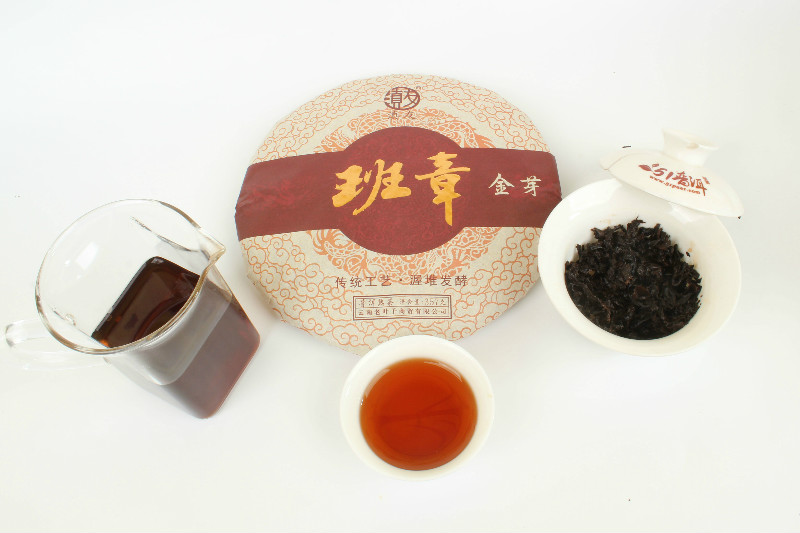 班章金芽普洱茶是采用勐海县班章自然村大叶种晒青毛茶作原料,经人工发酵后压制成饼,具有外形条索紧结完整,金毫显露,内质汤色红浓明亮,香气纯正,陈香浓郁,叶底褐红,滋味醇厚回甘的品质特征。