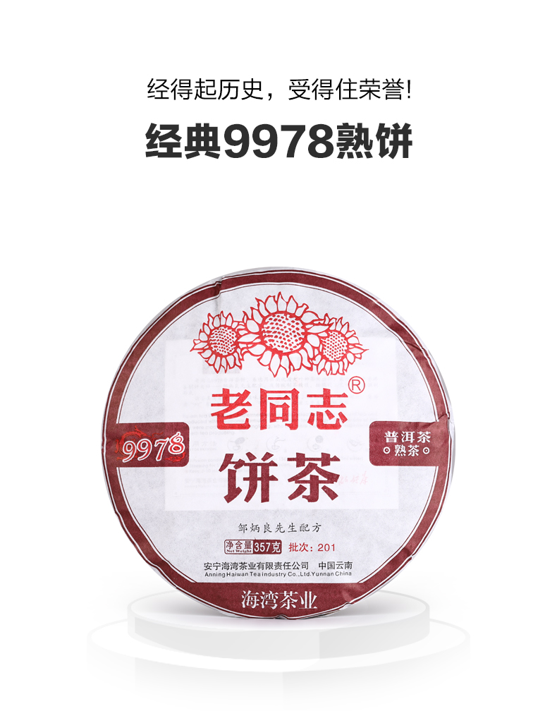 老同志 9978由凝聚50年茶叶审评经验的邹炳良先生精心调配而成。9978熟饼选用经中国绿色食品发展中心认证的云南大叶种生态茶园茶青为原料,经适度发酵,精制整形后由邹炳良先生精心调制而成,属海湾茶业“99”配方产品之一。该茶条索紧结,滋味醇厚,可即泡即饮,存放三年五载滋味更佳。饮后生津止渴,齿唇余香,是生态、安全、卫生的健康饮品。