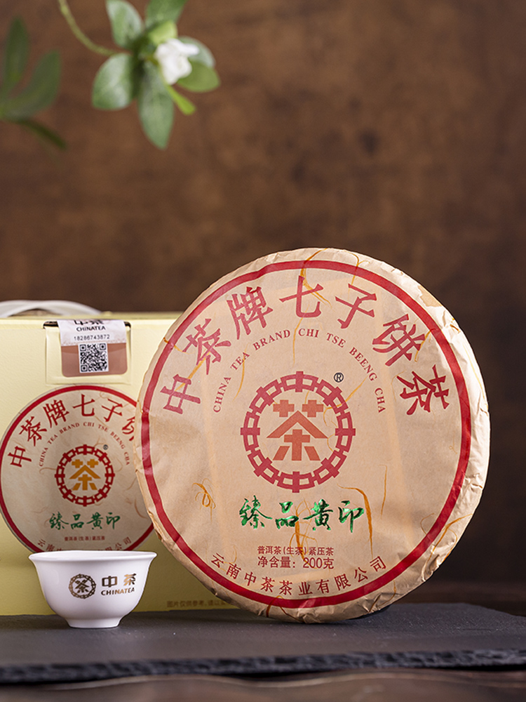 本品臻选云南西双版纳勐海县境内海拔1600米以上古生态茶园高级春蕊茶菁,精选肥嫩芽叶,轻度发酵,专业茶师精心拼配,传统工艺压制。该茶起源于20世纪50年代末,由于茶饼外包装纸八中圈中的“茶”字为黄色,业界通称为“黄印圆茶”。70年代后按“黄印圆茶”的拼配工艺,推出“黄印七子饼”。本品延续黄印经典的配方,饼形圆润光滑,金毫显露,色泽红褐润泽,香气幽雅,汤色艳丽,滋味醇润甘爽的品质特点。喉韵如丝绸般光滑,叶底柔软又富有活力,是品饮、收藏之臻品。