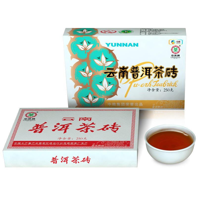 中茶牌普洱茶砖——金花熟砖(熟茶)是采用传统工艺发酵而成,砖形饱满方正,厚薄均匀,松紧适度,条索壮实,色泽褐黑,芽毫显露;内质汤色红亮,香气陈香浓郁,滋味入口润滑,醇和回甘。是一款既可满足您日常饮用,也宜聚友品饮的茶。