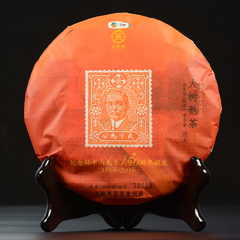 中茶普洱面向消费者推出的限量版"孙中山先生150周年诞辰纪念茶",纪念茶为一生一熟,均采用云南西双版纳勐海境内的布朗山高山生态大树茶为原料,经中茶茶师精心拼配而成。