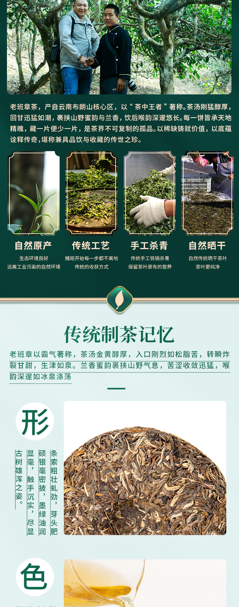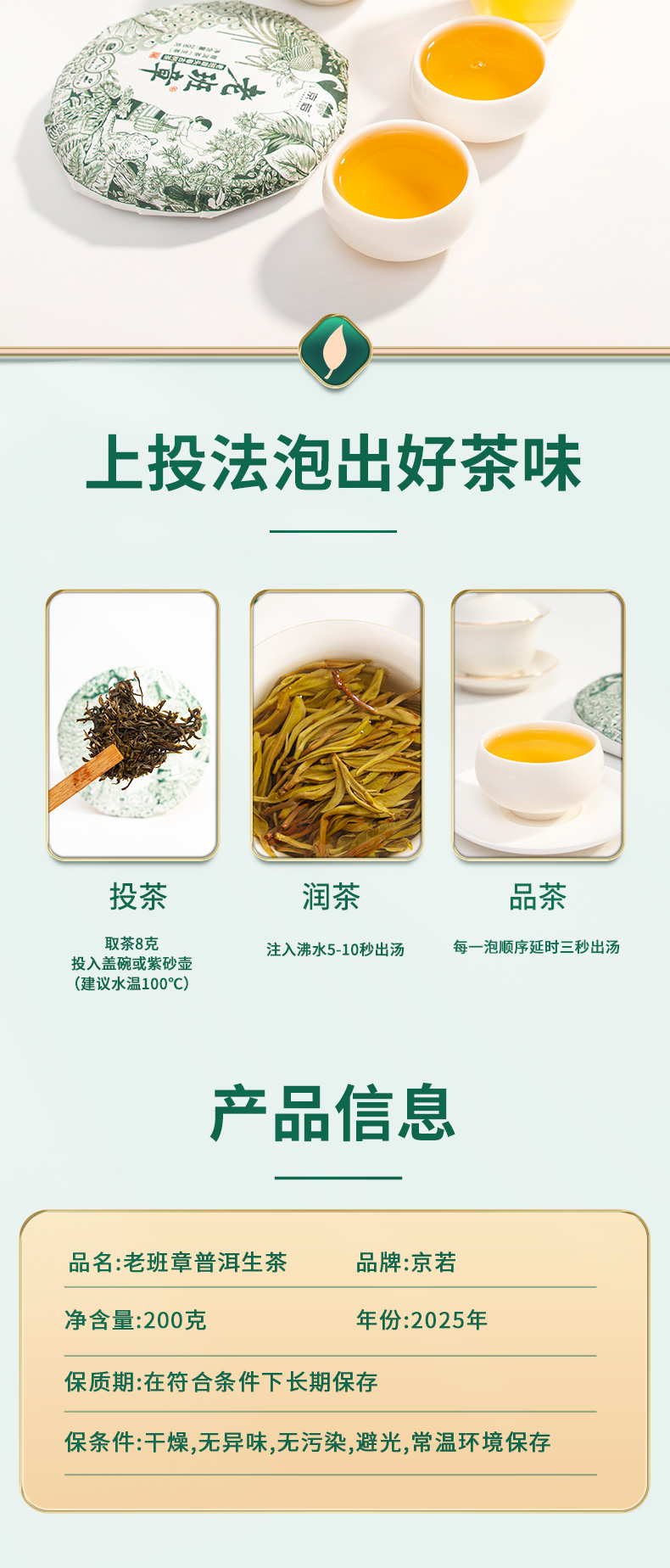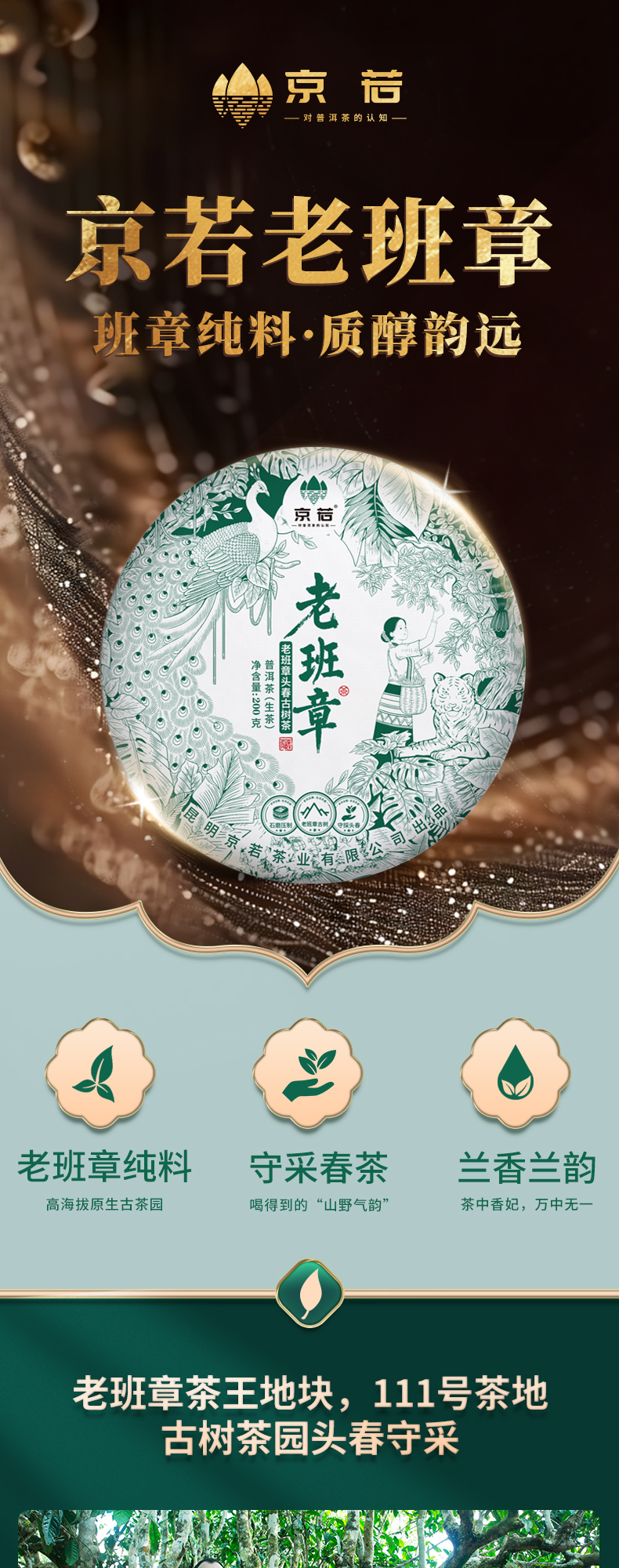 本品为京若品牌诚意之作,原料严格守采于老班章村111号刘书记家古树茶园,甄选头拨珍贵春茶。开汤刹那,高昂的兰花香与蜜韵便喷薄而出,冲泡间满屋飘香。茶汤入口汤感细腻如丝,兰香紧密包裹着清冽的蜜甜,标志性的强劲苦底在舌尖一掠而过,即化甘泉。其非凡之处在于,随着冲泡层层深入,兰香的穿透力与茶汤的甜润度交织攀升,越喝越香甜,喉韵深远清凉,将老班章古树生茶霸烈之气化为绵长内劲,尽显核心地块古树的深厚底蕴与迷人风采。