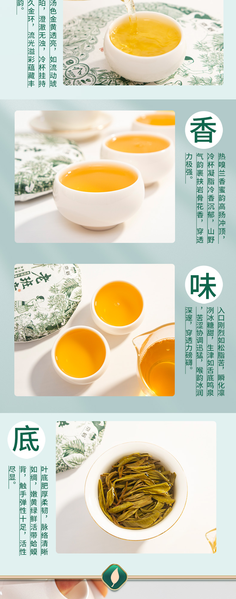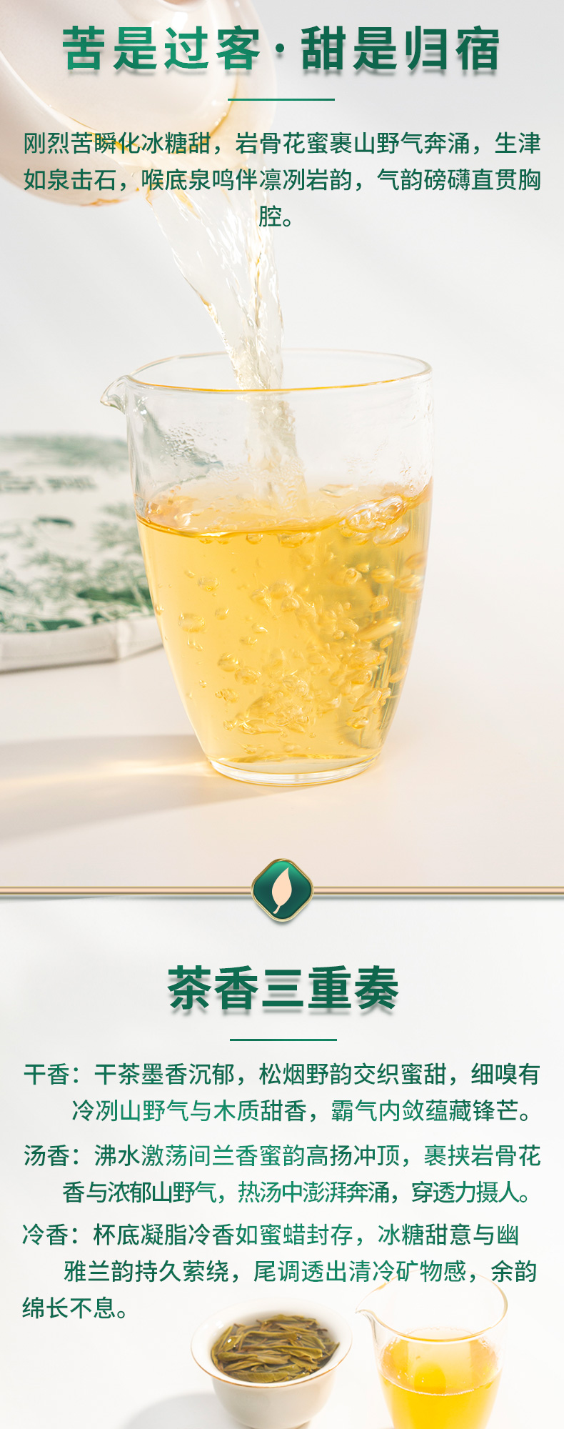 入口细腻饱满,苦底迅疾化开为绵长甘甜,兰香落水,生津回甘迅猛,喉韵清凉深邃。