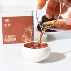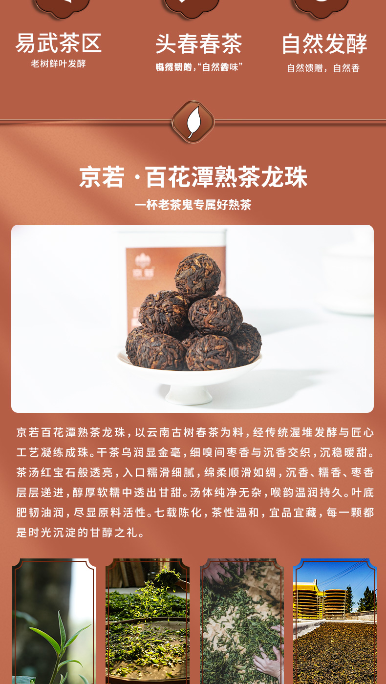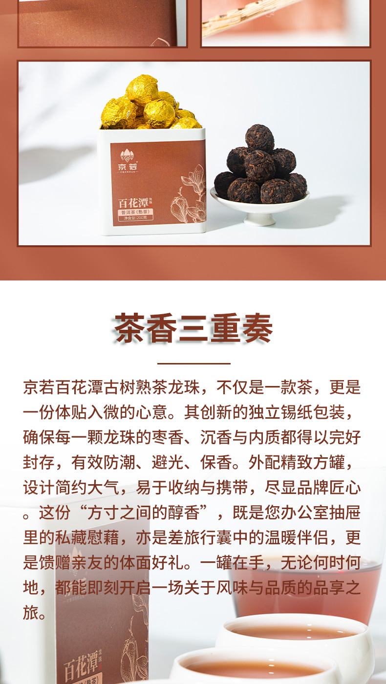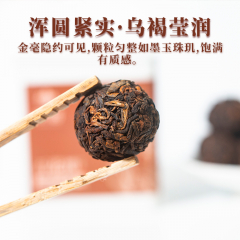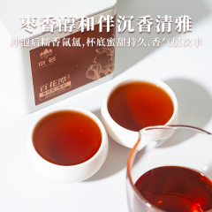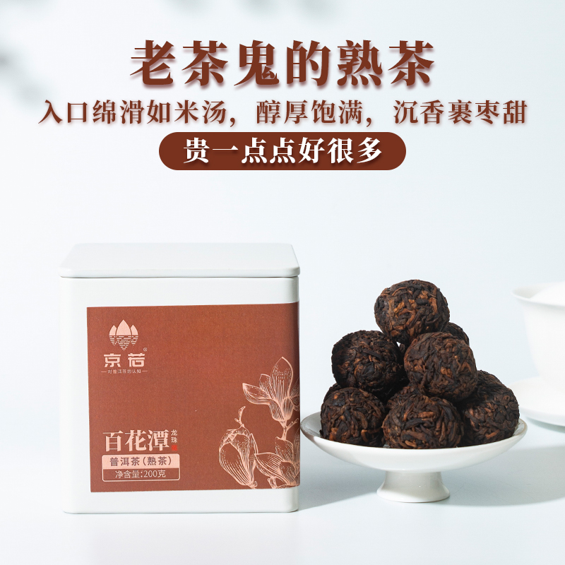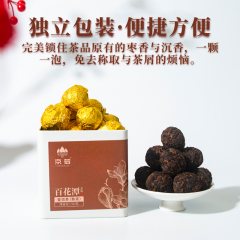 京若百花潭熟茶龙珠,以云南古树春茶为料,经传统渥堆发酵与匠心工艺凝练成珠。干茶乌润显金毫,细嗅间枣香与沉香交织,沉稳暖甜。茶汤红宝石般透亮,入口糯滑细腻,绵柔顺滑如绸,沉香、糯香、枣香层层递进,醇厚软糯中透出甘甜。汤体纯净无杂,喉韵温润持久。叶底肥韧油润,尽显原料活性。七载陈化,茶性温和,宜品宜藏,每一颗都是时光沉淀的甘醇之礼。