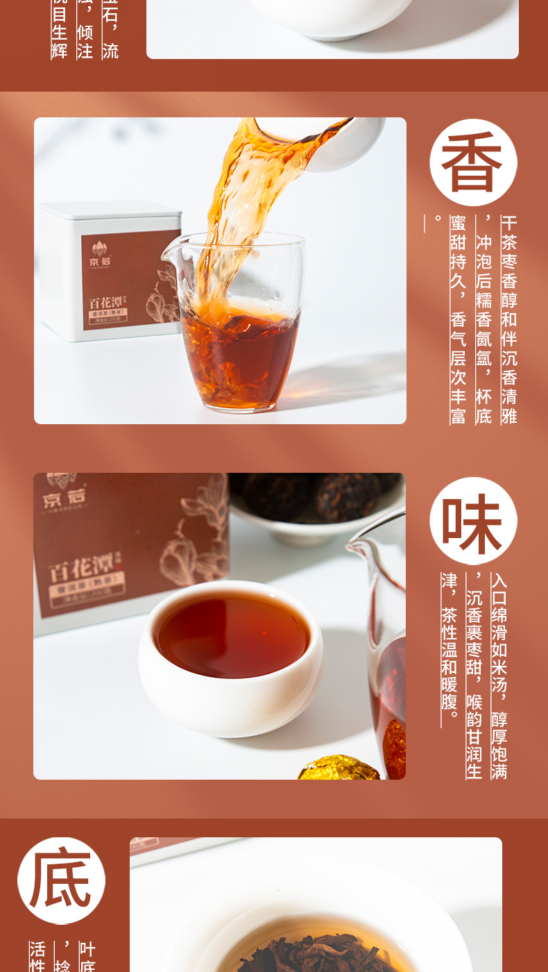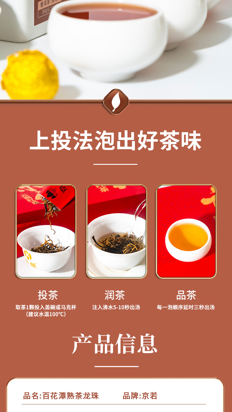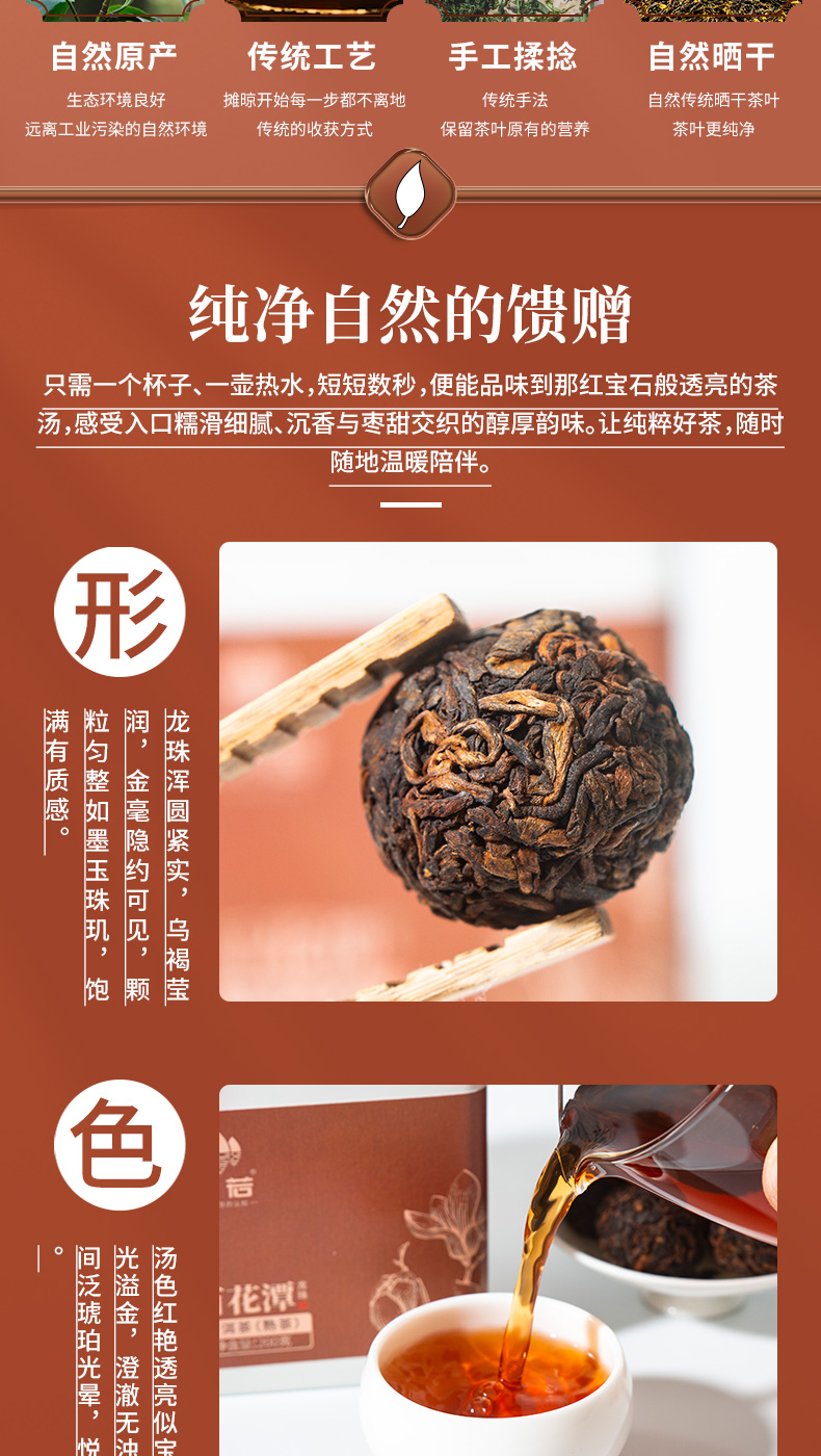 京若百花潭熟茶龙珠,以云南古树春茶为料,经传统渥堆发酵与匠心工艺凝练成珠。干茶乌润显金毫,细嗅间枣香与沉香交织,沉稳暖甜。茶汤红宝石般透亮,入口糯滑细腻,绵柔顺滑如绸,沉香、糯香、枣香层层递进,醇厚软糯中透出甘甜。汤体纯净无杂,喉韵温润持久。叶底肥韧油润,尽显原料活性。七载陈化,茶性温和,宜品宜藏,每一颗都是时光沉淀的甘醇之礼。