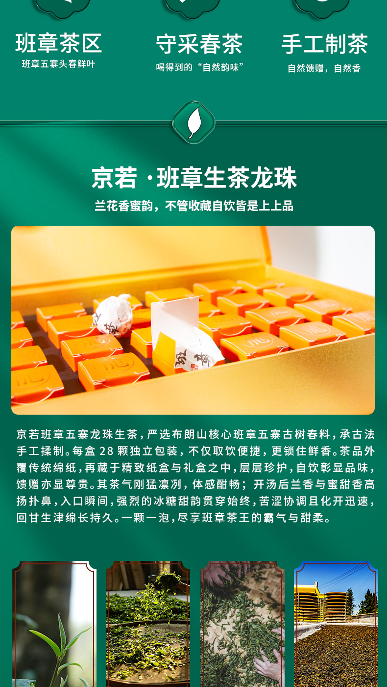 京若班章五寨龙珠,甄选布朗山班章五寨核心产区古树春茶为原料,传统手工揉制而成。茶品凝聚班章茶区独特气韵,茶气刚猛霸道,饮后体感明显,喉韵深沉。其香气高扬,兰花香与蜜甜香交织,茶汤入口即能感受到强烈的冰糖甜韵,苦涩协调化开迅疾,回甘生津持久绵长。龙珠形态小巧便携,一珠一泡,尽显班章茶的王者风范与甜柔底蕴。