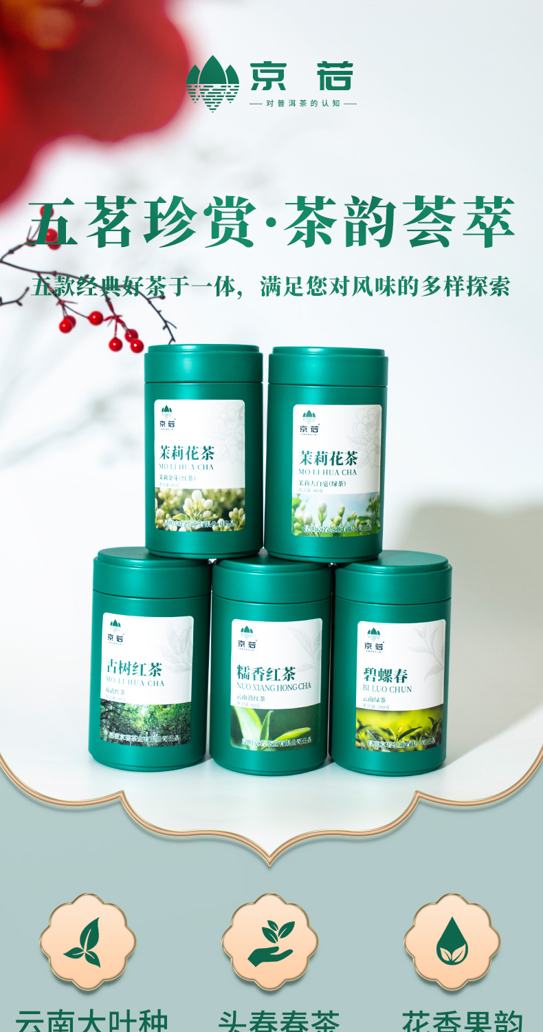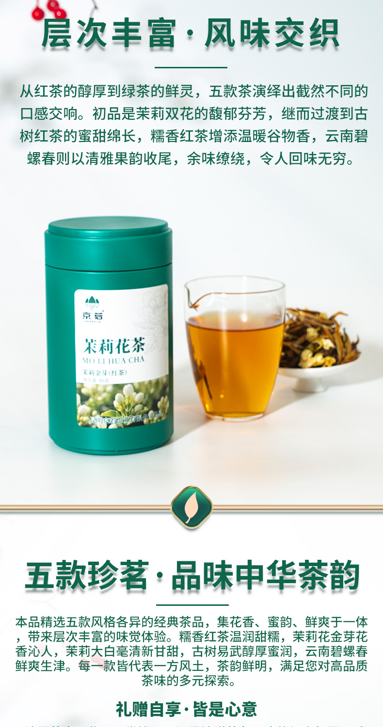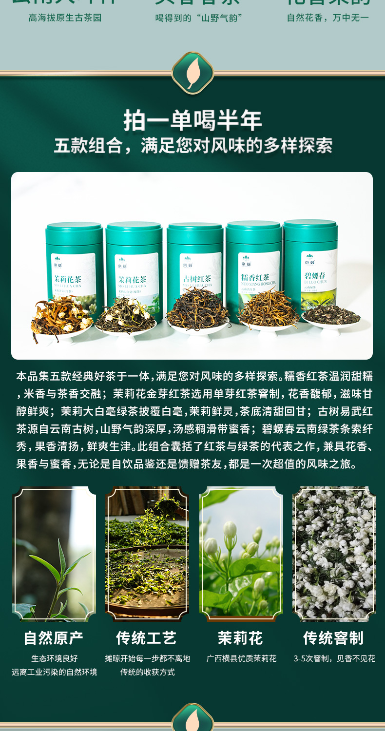 本品集五款经典好茶于一体,满足您对风味的多样探索。糯香红茶温润甜糯,米香与茶香交融;茉莉花金芽红茶选用单芽红茶窨制,花香馥郁,滋味甘醇鲜爽;茉莉大白毫绿茶披覆白毫,茉莉鲜灵,茶底清甜回甘;古树易武红茶源自云南古树,山野气韵深厚,汤感稠滑带蜜香;碧螺春云南绿茶条索纤秀,果香清扬,鲜爽生津。此组合囊括了红茶与绿茶的代表之作,兼具花香、果香与蜜香,无论是自饮品鉴还是馈赠茶友,都是一次超值的风味之旅。