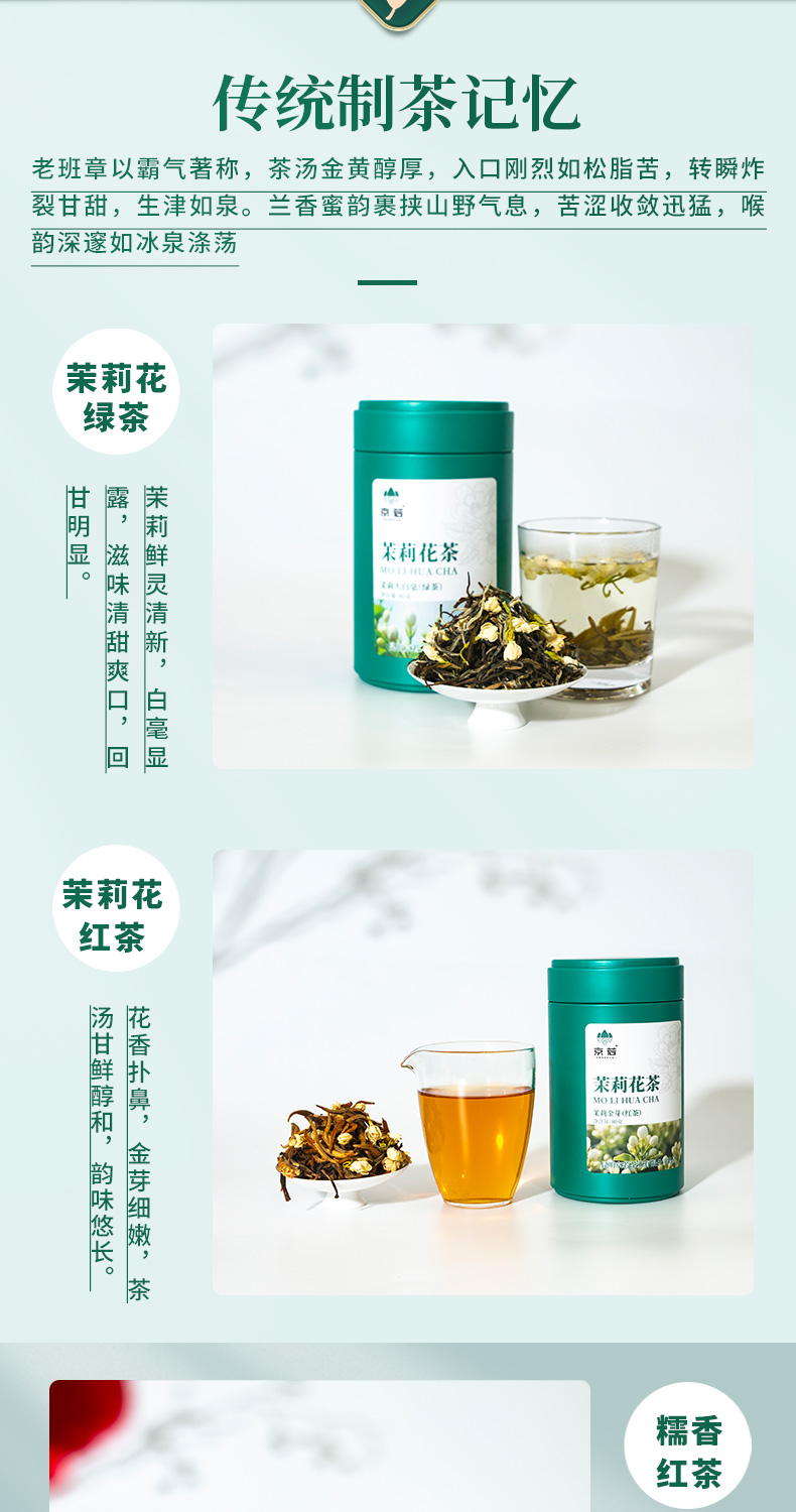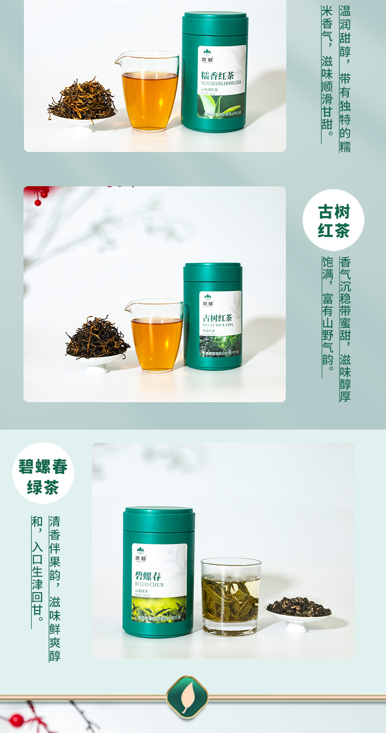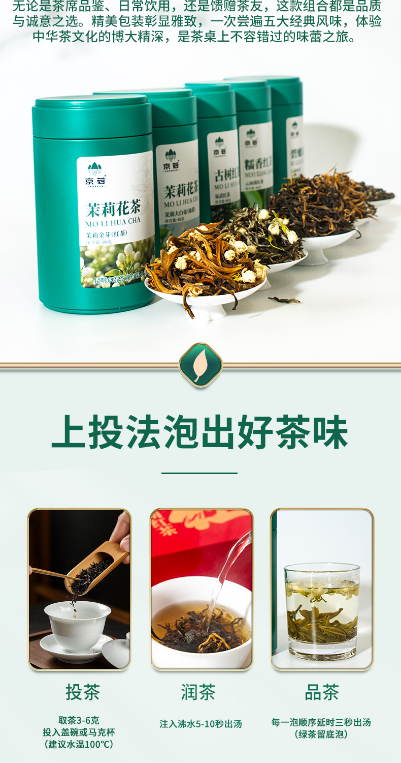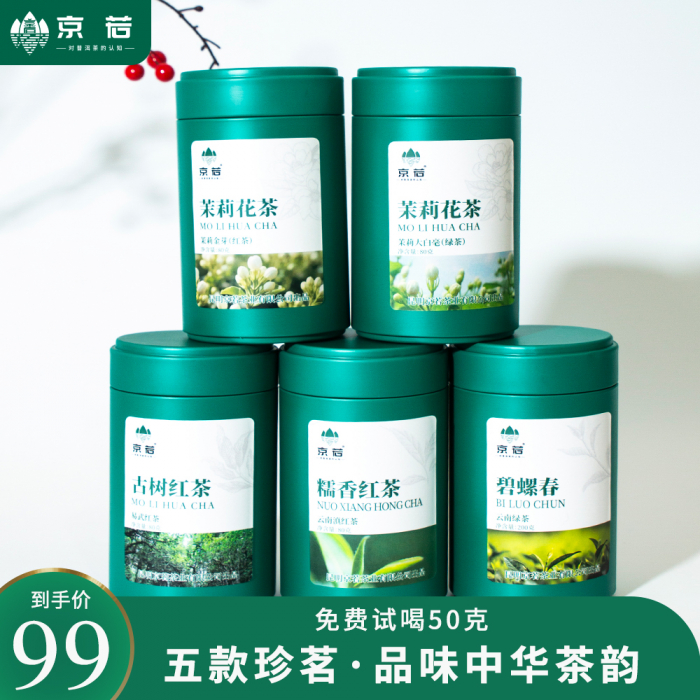 本品集五款经典好茶于一体,满足您对风味的多样探索。糯香红茶温润甜糯,米香与茶香交融;茉莉花金芽红茶选用单芽红茶窨制,花香馥郁,滋味甘醇鲜爽;茉莉大白毫绿茶披覆白毫,茉莉鲜灵,茶底清甜回甘;古树易武红茶源自云南古树,山野气韵深厚,汤感稠滑带蜜香;碧螺春云南绿茶条索纤秀,果香清扬,鲜爽生津。此组合囊括了红茶与绿茶的代表之作,兼具花香、果香与蜜香,无论是自饮品鉴还是馈赠茶友,都是一次超值的风味之旅。